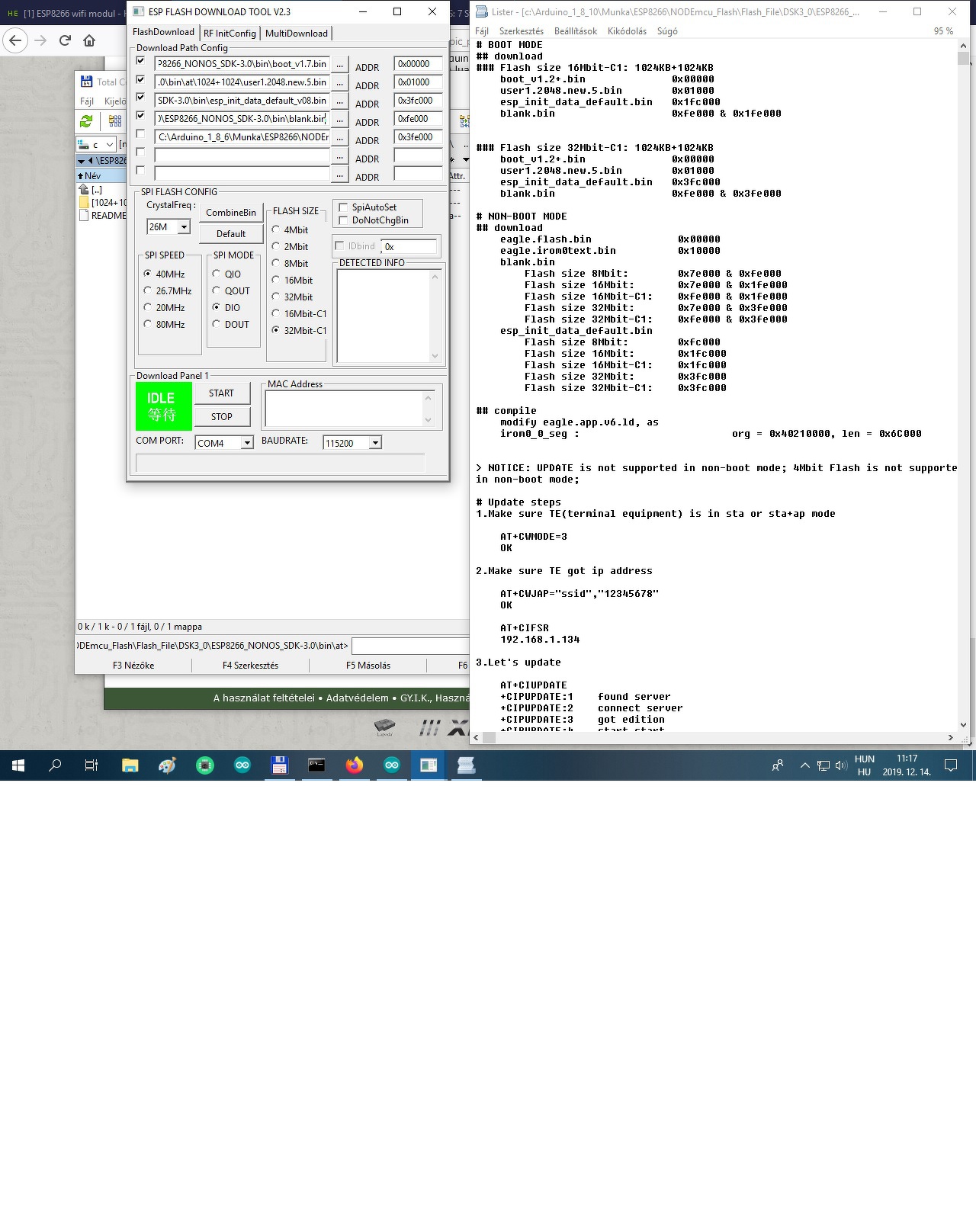 Ezidáig arduinoval foglalkoztam játszadozás szinten. Mostanában akadtam rá az ESP8266-ra. Rendeltem mindjárt NodeMCU 12-E lua v3-at kinából és nagyon jó eszköznek tartom.Feltelepítettem az arduino legújabb változatát (v1.8.10) win10 alatt. Próbálgattam az AT parancsokat, a kapcsolódást a wifi-hez, ezzel nem is volt semmi bajom. Elkezdtem példaprogramokat töltögetni rá, volt ami rendesen működött is, de voltak amiktől elszállt, memóri dump-ot írva és újraindult. A topikot olvasgatva erre a kérdésre meg is lett a válasz. Próbáltam több freemwaret is tenni a modulra. A topik elején esett szó a FLASH_DOWNLOAD_TOOLS_v2.4 "űrkategóriás" programról. Valamiért jobban tetszik ,mint azok a flashprogramok amiknek csak a 4MB-os .bin-t kell megadni (ESP8266Flasher). Valaki el tudná mondani, hogy miért azokra címekre kell tölteni a a megadott file-ket, értem én hogy a flash méretétől függ a dolog elsősorban. Ha más területekre tölthetém a .bin-eket, lehet hogy több hely maradna a programnak és nem szállna el. A user1.bin-ből és a boot_vx.x.bin-ből van több verzió, (512 ill.1024) ezek a memóri lapok mérete? Melyikkel érdemes próbálkozni? Azért szeretnék többet tudni a memória felosztásról, mert szeretném használni az SPIFFS feltöltést, de az arduino IDE-ben a Flassh size-ben csak OTA típust tudok kiválasztani, de a feltöltés menüpontot már "beaplikáltam" . Köszönettel:gapati