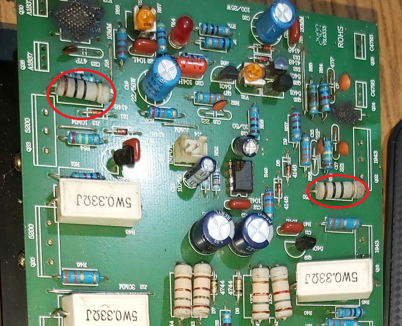 Szia! Elnézve a kormolódásokat, olyan mintha az alkatrészektől független anyag égett volna az erősítőben.