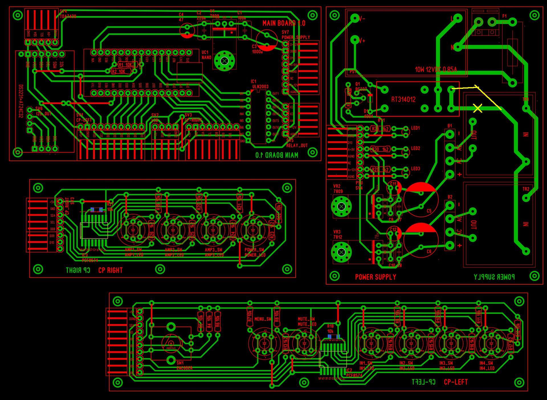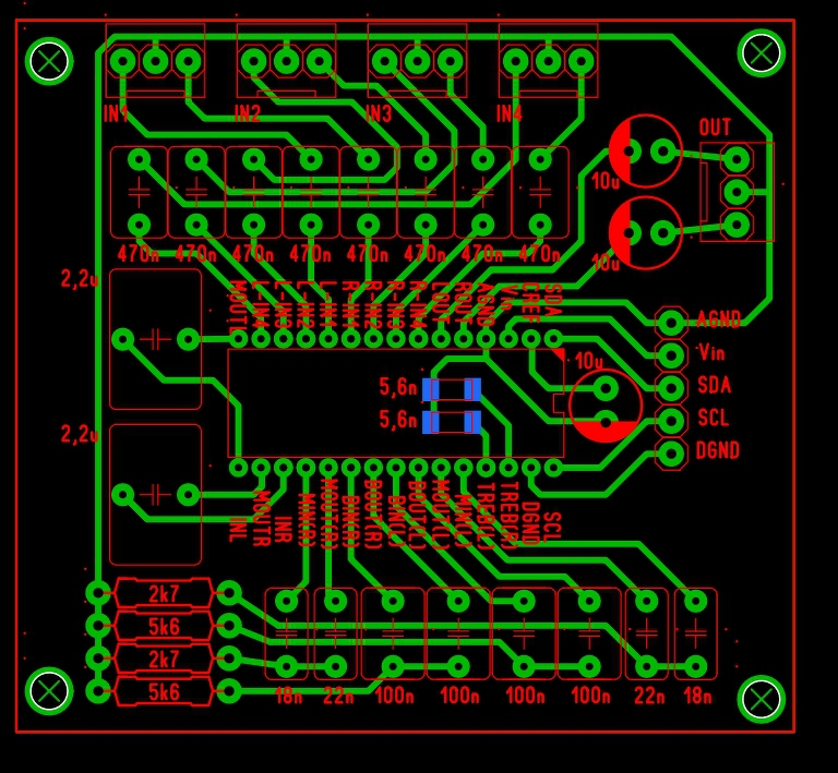 Kicsit át terveztem a NYÁK-ot, félek az áthallás veszélyétől, hogyha a lábak között viszem az audió jelet. A GND és TÁP vonalát megvastagítottam, betettem a lehetü legközelebb egy 100n ellenállást. Viszont a kicsatoló kondikhoz kért ellenállást - lámaként - nem tudom hogy kell kötnöm.