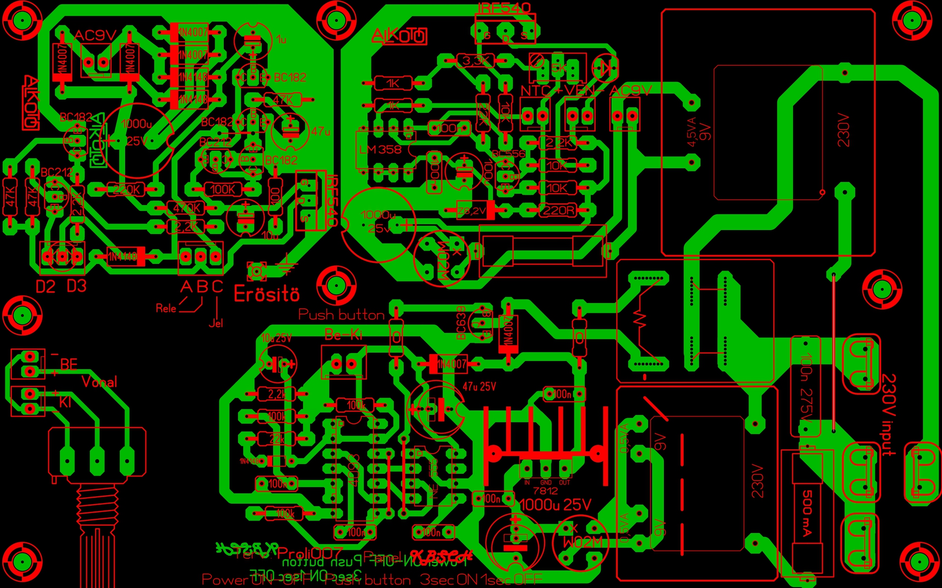 Az előttem hozzászóló jól írta, de még nagyobb gond is van a nyákon, mivel gondolom, hogy egyetlen nagy nyáklemez lenne. A nagy relét én a szekunder oldaltól kissé /legalább egy centivel /távolabb helyezném el, ha már hálózatot kapcsol, mert túl közel van a kis biztihet a tekercs kivez. lába, ez is biztonsági szempont, valamint ha a lábai közt sávot vezetsz át, akkor ha ennél jobban nem tudod kivitelezni akkor amikor furkálod akkor a kritikus távolságok miatt a relé lábai között maróval réseld be a nyákot, különben teljes életveszély így most. Réselést biztosan láthattál már PC és egyéb tápok nyákjain kialakítva.