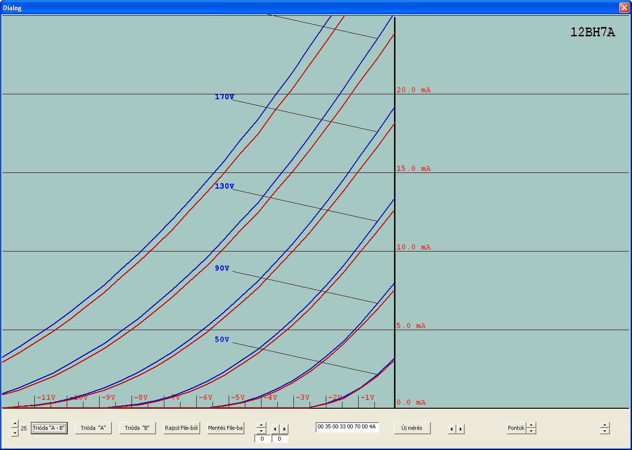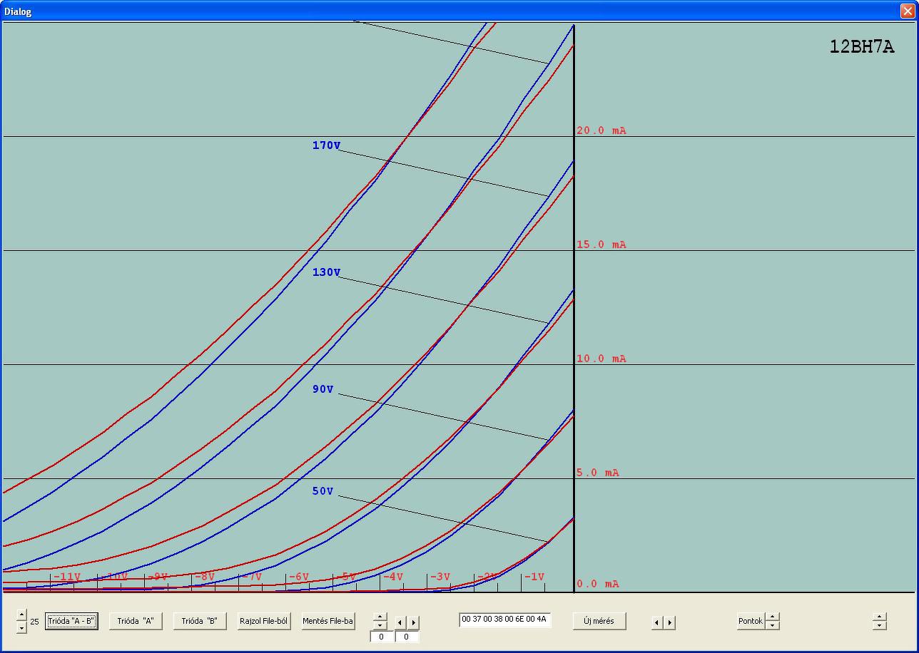 1, 12BH7A-2 ennek mintaszerű a grafikonja, a két csőfél között van egy kevés aszimetria, de összességében gyönyörűen együttfutnak a görbék. 2, 12BH7A-1 ez viszon erősen kifogásolható, mert a két csőfél telejesen más jellegű és nem lehet olyan munkapontot találni ahol a szimmetria létrejönne.