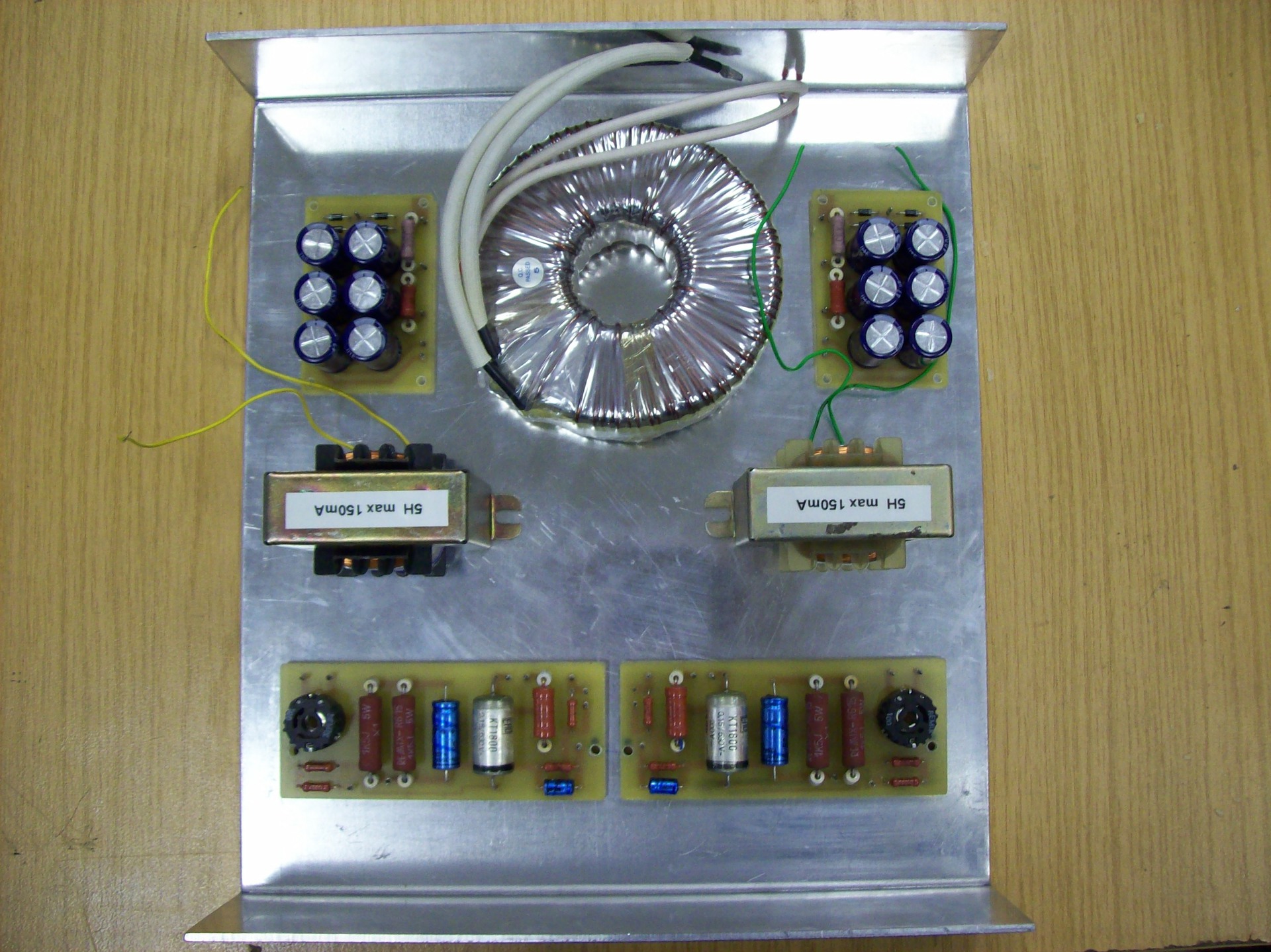 Szia. Egyenlőre ezekkel próbálom ki, mert ez volt. A táp panelek már készen voltak. Ha lesz brumm, növelni fogom a kondikat. A nagyja még hátra van. Toroid kézben tekerése 2 nagy menetszámú szekunderrel, kimenő trafók...