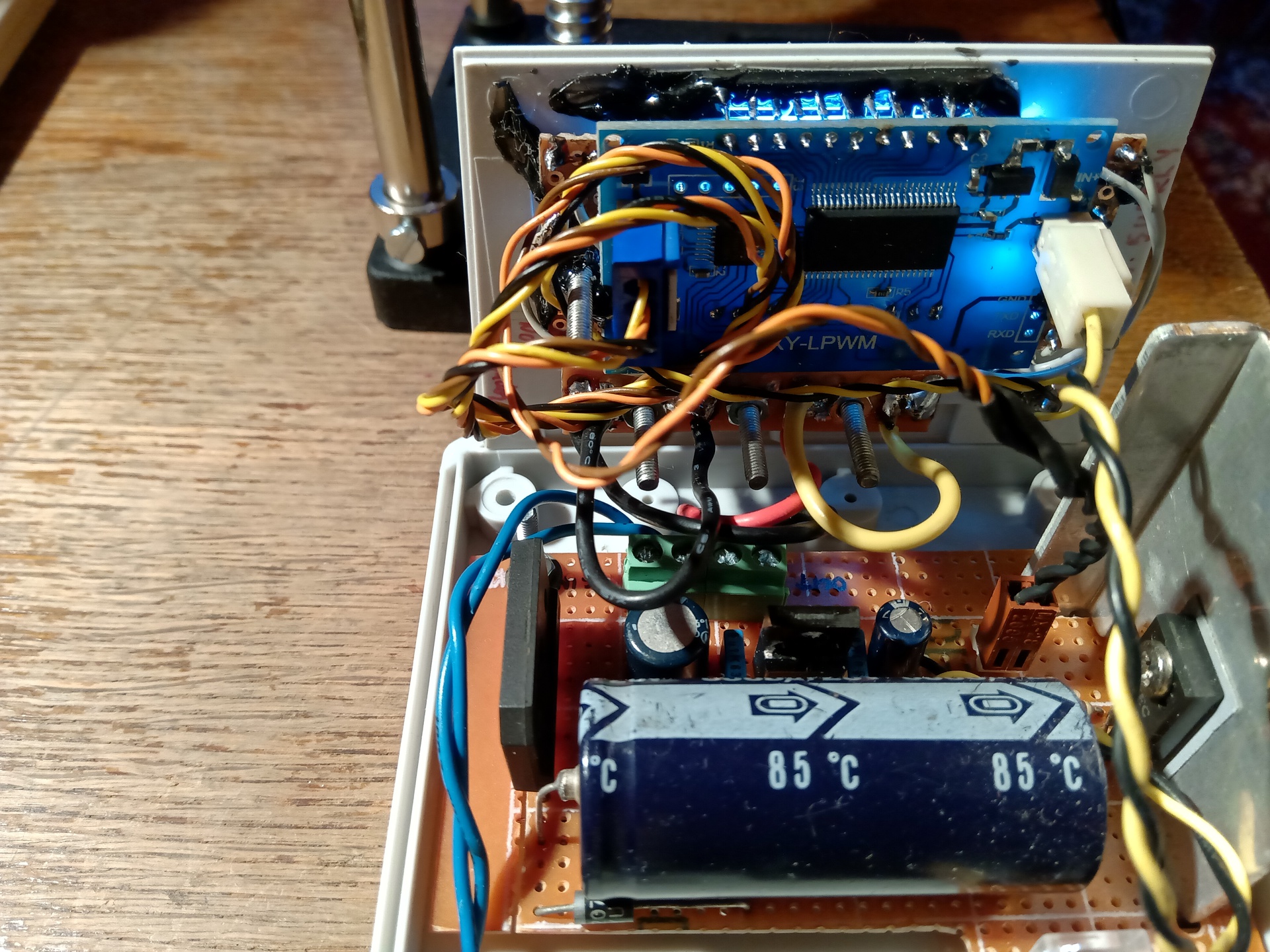 Persze. Nem életem fő műve, de működik. A kínai kontrollerre kellett egy kvarcot műtenem, mert a soros port pontatlan volt a belső órajelről, ezért van rajta egy kis öcsi panelen a kvarc. A csengő meghajtó egy kis motorvezérlő modul, aminek a felét használom.