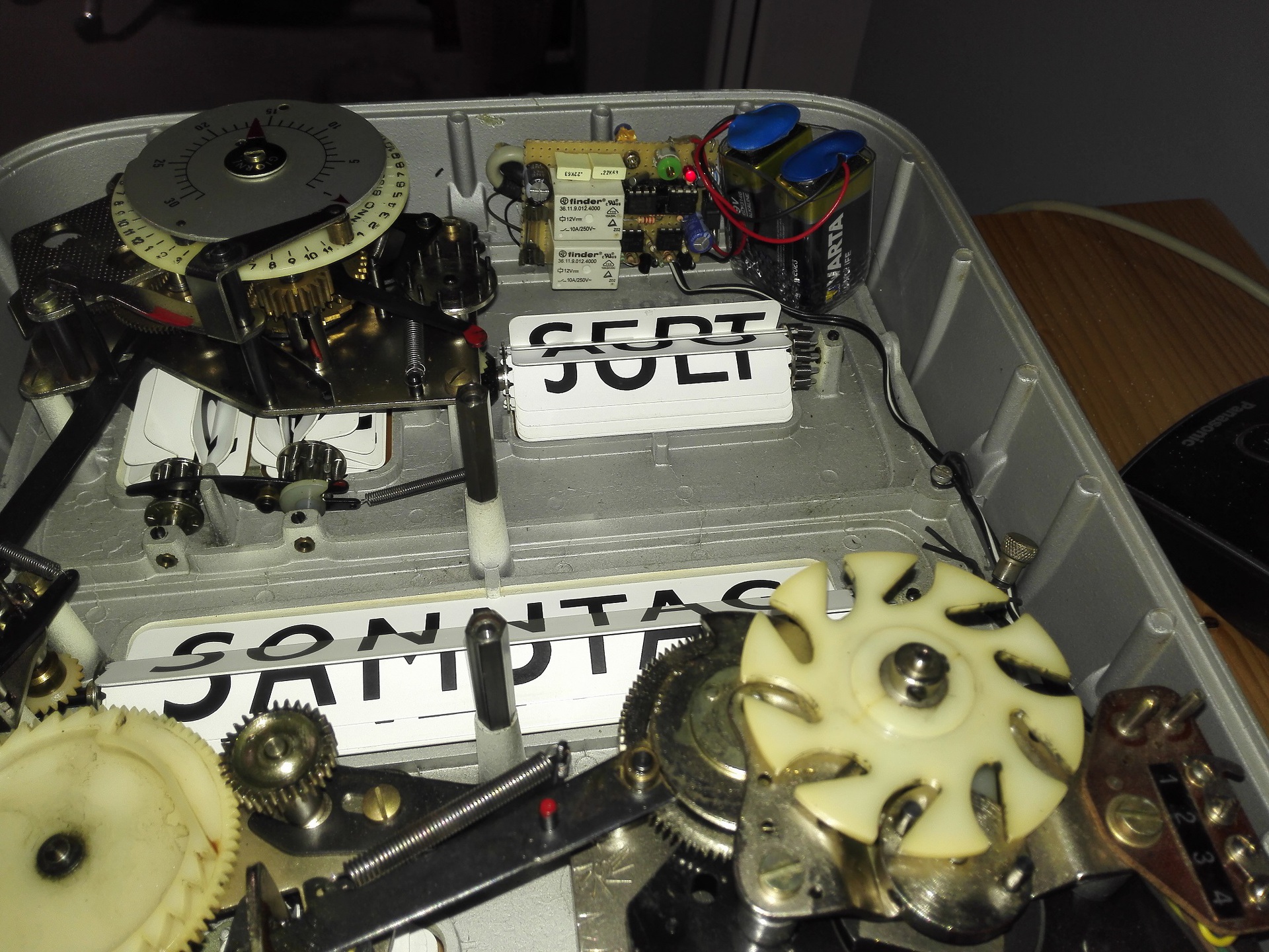 Cégben a padláson találtam egy régi óracsodát 1973-ból. Egy Német vasútállomáson szolgálhatta az utasokat. Szinte teljesen mechanikus, kivéve a meghajtást. Az elektronika egy külső egység volt ami egy két eres vezetékkel csatlakozott a léptetőmotorhoz. A külső egység elveszett. Érdekessége hogy tudja kezelni a szökőévet, persze mechanikusan. Ramatyul nézett ki. Volt mit tisztítani. A hátlap elég jól megsárgult. Hidrogén zselével sikerült valamennyire kifehéríteni. Készítettem hozzá egy vezérlőt. A pontosságot egy DS1307 RTC-re bíztam. A léptetőmotor vezérlés, a beállítás gomb kezelés és a működést jelző villogás egy PIC12F629 dolga. Külső tápegysége van. Ott kapot helyet a villogó led és a beállítógomb is. Az esetleges áramkimaradást két 9 voltos elem hidalja át. K.b. egy napig működik vele. Ez az elektronika kicsit modern a szerkezethez képest, de ez van. Már fél éve működik és tökéletesnek bizonyult.