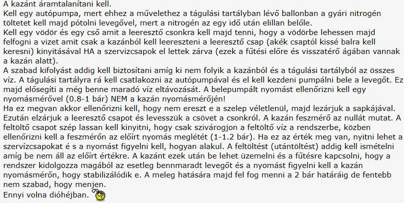 A házuk egy hosszú parasztház. A legmagasabb pontja a fűtés csőnek az ajtók kikerülésénél van az kb. 2,2 méter 24 literes a tágulási tartály és külön van, nem benne a kondenzációs gázkazánba. Igen vannak automata légtelenítők a rendszerben ilyent hogy víz csöpögést sehol nem észleltem az nem azt jelenti hogy nincs is. Akkor az automata légtelenítőket kikel cserélnem vagy csak takarítanom? A 24 literes tágulási tartályt leszerelni kiönteni belőle a vizet és úgy felfújni a megfelelő nyomásra?