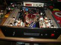 3,3 mikróm sem volt, 4,7-es elkót tettem be, negatívval kifelé. Hangpróba még nem volt. Az áramfelvétel gyakorlatilag nem változott: pozitív ágban 130mA-t, negatívban 110-et mértem, de tekintettel arra, hogy csak egy olcsó és ráadásul régi multiméterrel rendelkezem, ezt nem gondolom teljesen pontos és biztos értéknek. Amúgyis azt a plusz 30-50 miliampert valahogyan ki kéne adnia, benne nem maradhat - hő, fény, hang, mágneses sugárzás formájában, de a leírt melegedéseken kívül mást nem tapasztalok, tehát hacsak nincsen valakinek ötlete, mit nézhetnék még meg, akkor így hagynám. A képeken az egyik Urbán Quad405 a húsz éves sallangok és védelem nélküli sokáig ideiglenes összeszerelés látható - biztosíték is csak a 220-as ágban volt. Egy karosszériás barátommal csináltattam még anno három vasdobozt, azok egyikébe került bele ez a példány is, ahogy a képen látszik. Ennek most a lányom örül, kapott mellé még egy pár Videoton hangfalat is. Nem ez volt használatban, ez csak tartaléknak volt. Akkoriban kizárólag hamis végtranyókat lehetett kapni, vagy csak nekem nem volt szerencsém. A természetes kiválasztódásnak megfelelően az ebbe sokadjára beszereltek bírták. Valószínűleg véletlenül jobb minőségben hamisított valaki Közben egy másikba hozattam Németországból mexikói ON 2n3773-asokat és óvatosságból dupláztam őket, na azzal már nem volt baj, most is ezeket raktam mindhárom Quadba. Volt egy harmadik példány is, azt az öcsémnek készítettem anno, de most hogy dobozolni akartam, nem találja, lehet végleg elveszett. Ahelyett csináltam most a Ludwigot. Akkoriban, mivel lett egy megbízható Quadom, leállt a projekt, de most pótolom.