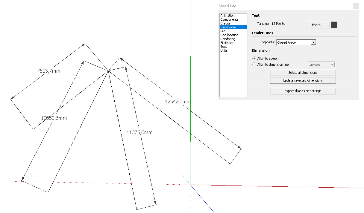 Szia! Alapvetően megvan a probléma gyökere. Az általad használt dimension nyilak csak a fő síkok mentén működnek. Szerencsére a Sketchup okosabb és minden szakaszt mér. Az "Entity Info" ablakban látod, ha egy szakaszra kattintasz, mennyi a valós mérete. Ugyanezt az infót meg tudod jeleníteni a pirossal karikázott eszköz segítségével is. Igaz - nem méretnyil, de látható. Ez azért alakult így, mert van a Sketchupnak fizetős verziója is, abban ez másképp működik picit, de itt szerintem megteszi. Én két vonallal meghosszabbítottam a fő tengelyek mentén a rávetítést és készítettem egy önálló méretszakaszt - ami lehetne rajzolt méretnyíl is, az adatokat pedig az Entity info adja. Így leírva bonyolult, de egy kattintás voltaképpen. A képről jobban látszik.