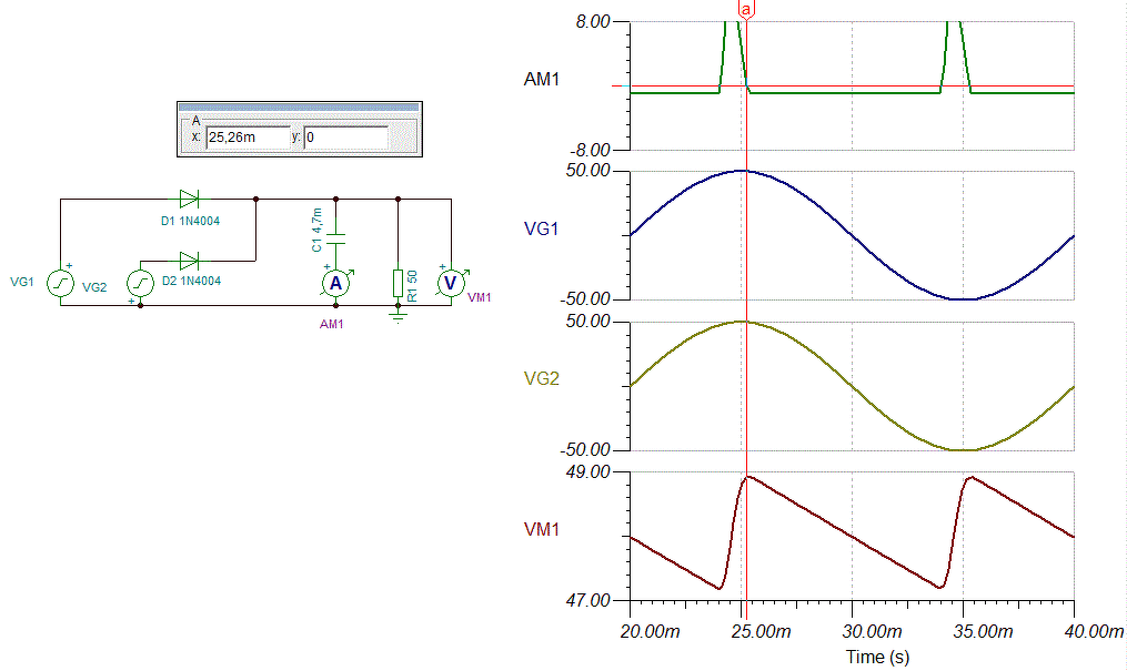 A diódát választottam meg helytelenül, az 1N4001 letörési feszültsége túl alacsony a 100 Vpp táphoz. Máris csatolom a javított változatot. A kondenzátoron folyó áram irányváltása azért itt is tettenérhető. A tárgyalt rajzon mindkét áramirányt fel kell tüntetni, csak értelmeznünk kell adott időpillanatban melyik is van érvényben.