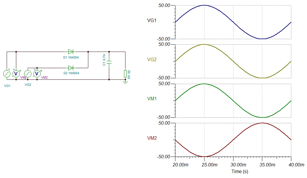 Értelek, de akkor a VG2-n pont fordított színusz jel van, mint a VG1-en adott pillanatban, hiszen fordított a kapocsfeszültségük? Akkor minden félperiódusban az egyik dióda enged át.