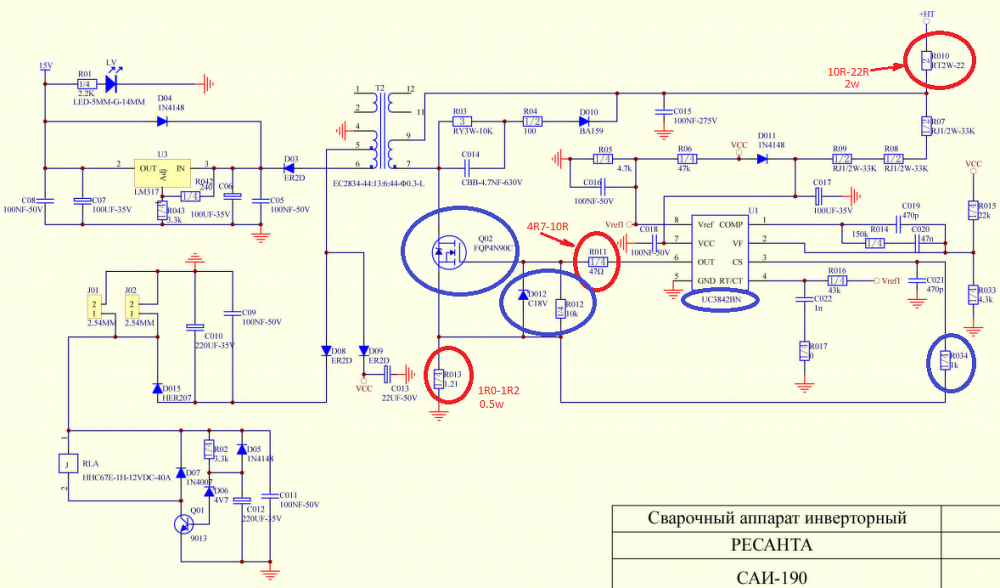 Ez a rajz alkalmazható a GÜDE gis 160- hoz is mert nagyban hasonlit hozzá. A T2 segédtrafó szekunder 4-5 kivezetéséről a D8 diódán át megy a ventillátor, a D9 en átmegy a VCC. A T2 segédtrafó szekunder 4-6 ról pedig a D3 diódán át panelok kapják a +15V-ot. Szóval enélkül hiányzik 3 kis értékü feszültség a müködéshez. Nem tudom, hogy a tiéd ilyen e, de hasonló lehet , követsd vissza a rajzon hátha segít.