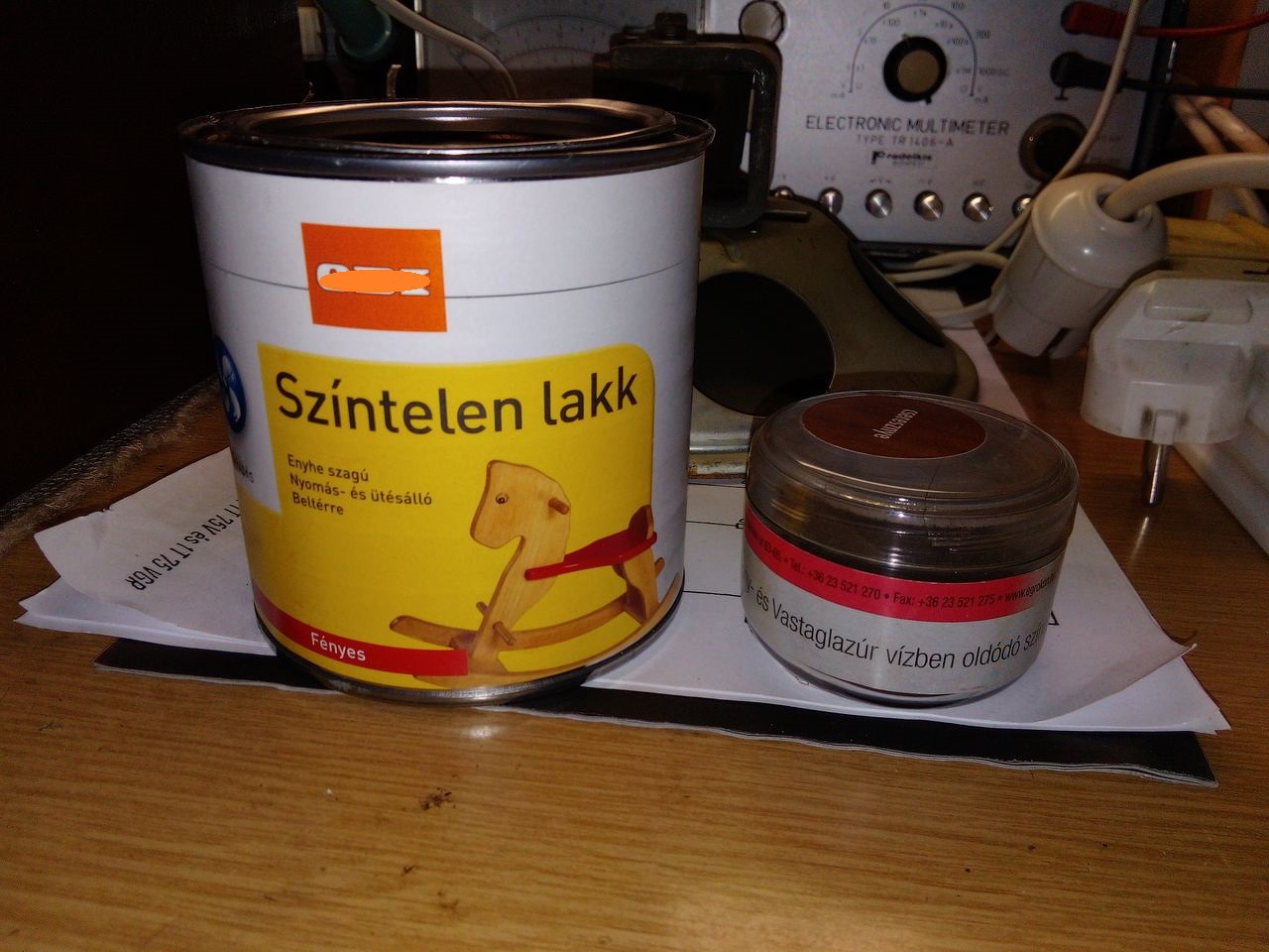 A színezővel kapcsolatba helyesbítenem kell, viszont ez a végeredményen nem változtat. A képen látható anyagokat használtam. A lakk egy hárombetűs barkácsáruház (kitakartam hogy ne legyen gond vele de azért ki lehet találni ) saját márkás vizes bázisú lakkja, a színező viszont nem pác ahogy írtam, hanem vízben oldódó lazúr. Eredetileg pácot kerestem ezt ajánlották, elnézést a tévedésért.