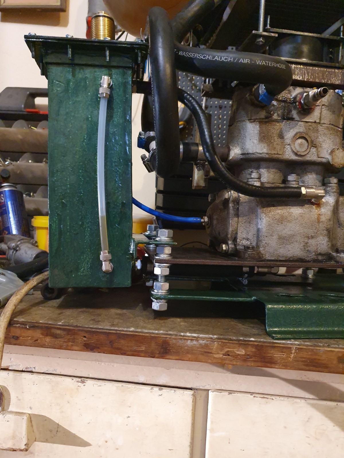 Küldök néhány képet is. Nehézséget jelentett hogy a hűtőt nem tudtam légteleníteni. Ezt egy 2mm-es kicsi csavarral oldottam meg a Suzuki fűtőradiátor tetején. Az előző képen nem látszott, hogy a tartály valójában a kompresszor alaplapja alatt egy 16mm es furatú csővel van bekötve a kompresszorhoz. A karterben habosodó illetve felnyomott olajat valójában mint ahogy azt valaki javasolta természetes olajkeringtetésre használom. Most a főtengely feléig van feltöltve olajjal és amikor működik akkor megemelkedik az olaj szintje de ezt a puffer tér tudja kezelni. vagyis minél többet nyom vissza a tartályba annál nagyobb súllyal próbálja azt az alsó csövön visszatölteni a kompresszorba.