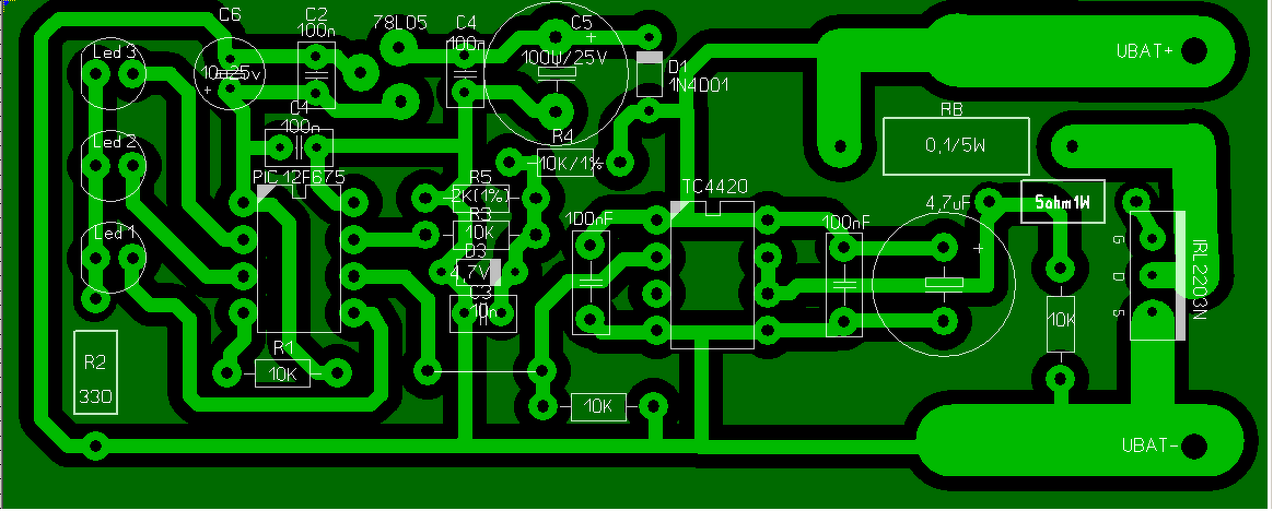A kontroller kimenetén, amelyik a TC4420 bemenete felé megy, nincs lehúzó ellenállás (10 kOhm). A TC4420 kimenetén nincs lehúzó ellenállás (10 kOhm), ellenben van kondenzátor, ami egyenesen káros (2.5 nF). A TC4420 kimenetén nincs soros ellenállás (5 Ohm/1W). TC4420 táplábaihoz 100 nF kell, nem 1 nF. A feszültségméréshez nem kell soros ellenállás (R3), csak rontja a pontosságot. Ha az MCLR lábat nem használod és belsőre állítod, az ellenállás (R1) elhagyható, a lábat sem kell bekötni. D1 valamilyen izmosabb dióda legyen, pl. 1N4001, az 1N4148 lehet, hogy már az első bekapcsoláskor dob egy hátast. Utóbbi egy egyszerű kapcsolódióda, nem ilyen feladatra lett tervezve. R2-nek nagyobb helyet csinálj, tervezd 1 W-osra és biztosítsd a programban, hogy egyszerre csak az egyik LED kapjon áramot.