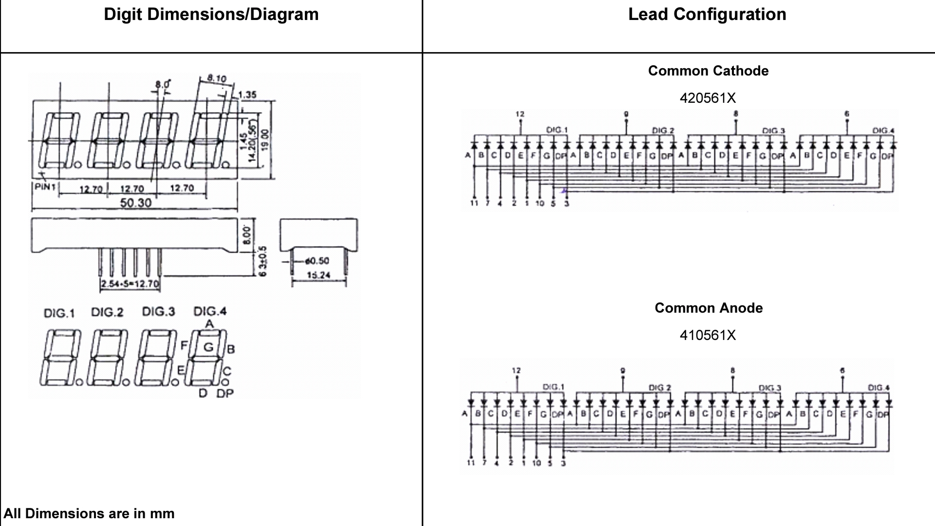When I tried to used them I relized that the part number was different than the one in the photographs and also there was no datasheet to be found on the Internet for the part number i got (CL5642BH3)... After a lot of testing, I just wasn't able to make the DP led to switch on for digits no 1,2 and 4. The other LEDs worked OK. These dispalys may be cheap, but using them is a pain. Closest datasheet I came across is this one http://www.plexishop.it/pdf/Datasheet%206091%20display%205462bs.pdf. If the product is not faulty a datasheet or a basic connection diagram should be provided.