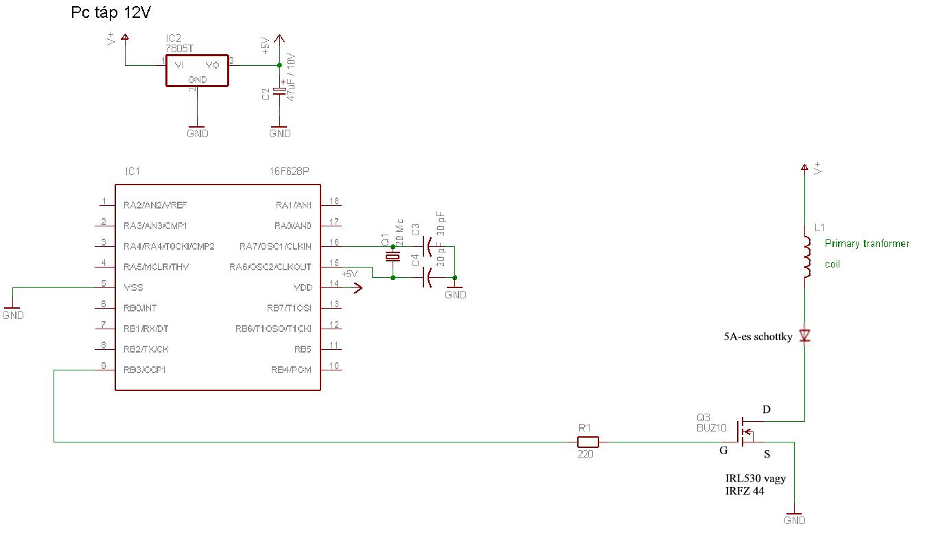 A bázis 12V ot kap (pc táp), erről kap a pic 5V ot egy l7805 ön és a 'nyers' 12V ra megy a tekercs, fet stb. A menetszám 100 a bázis 150 a forgórész. Ma csináltam meg a 10. párt és az 555 ről indítva ad kb 10V ot egyenirányítás, kondi, zéner után. ha rákötök pl egy 3V os motrot a fesz leül és a motor nem mozdul. Ha az 555 helyett a bázisra kötöm akkor meg se moccan, nem indul el a trafó. A bázis így néz ki most. Úgytudom a távval is kell valamit csinálni, hogy a pic felébredjen. Távom még nincs így nem tudom arról ébreszteni.