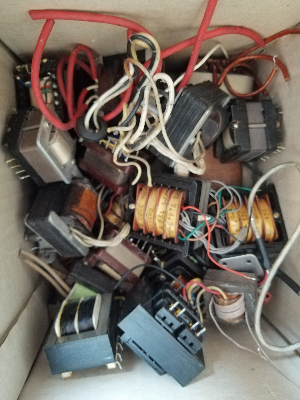 Mindegyik régi, bontott és ami senkinek sem kell, megy elektronikai hulladékba. 1. Nagyáramú biztosítékok - ránézésre jók (legalábbis a belső szál még megvan bennük) 2. Diódák - Ismeretlen állapotúak, de valószínűleg jók. A dobozban vannak még egyéb (de erősen hasonló) típusok. 3. Ismeretlen célú doboz, E84L típusú csővel (ránézésre jóknak tűnnek) a 3. dobozból hiányzik a cső 4. Kisméretű ferrites trafók - többségük kapcsolóüzemű tápból. Jellemző méretük 1.5 - 4 cm 5. Íróhegy - valami rajzoló eszközhöz voltak. 4 doboz, dobozonként 5 db, de az egyik dobozból hiányzik 1 db, egy másik használtnak tűnik. Nem tudom, hogy jók-e, mert ha kipróbálnám, akkor már elkezdenének kiszáradni. Fekete és piros színűnek gondolom. 6. Kisméretű lemezelt trafók - vélhetően audio célra készültek, de lehet közöttük hálózati trafó is jellemzően 5cm-es mérettartományban 7. Régi, öreg kondik - ha senkinek sem kell egyben, akkor külön csak a kis nem-elkókat is odaadom. 8. Nagyfrekis dobozok - 5 db, 27 x 9 x 4.5 cm méretűek. A belsejük 3-4 részre osztott, némelyikben van még valami elektronika is (pl. az egyikben 20MHz-es kvarc).