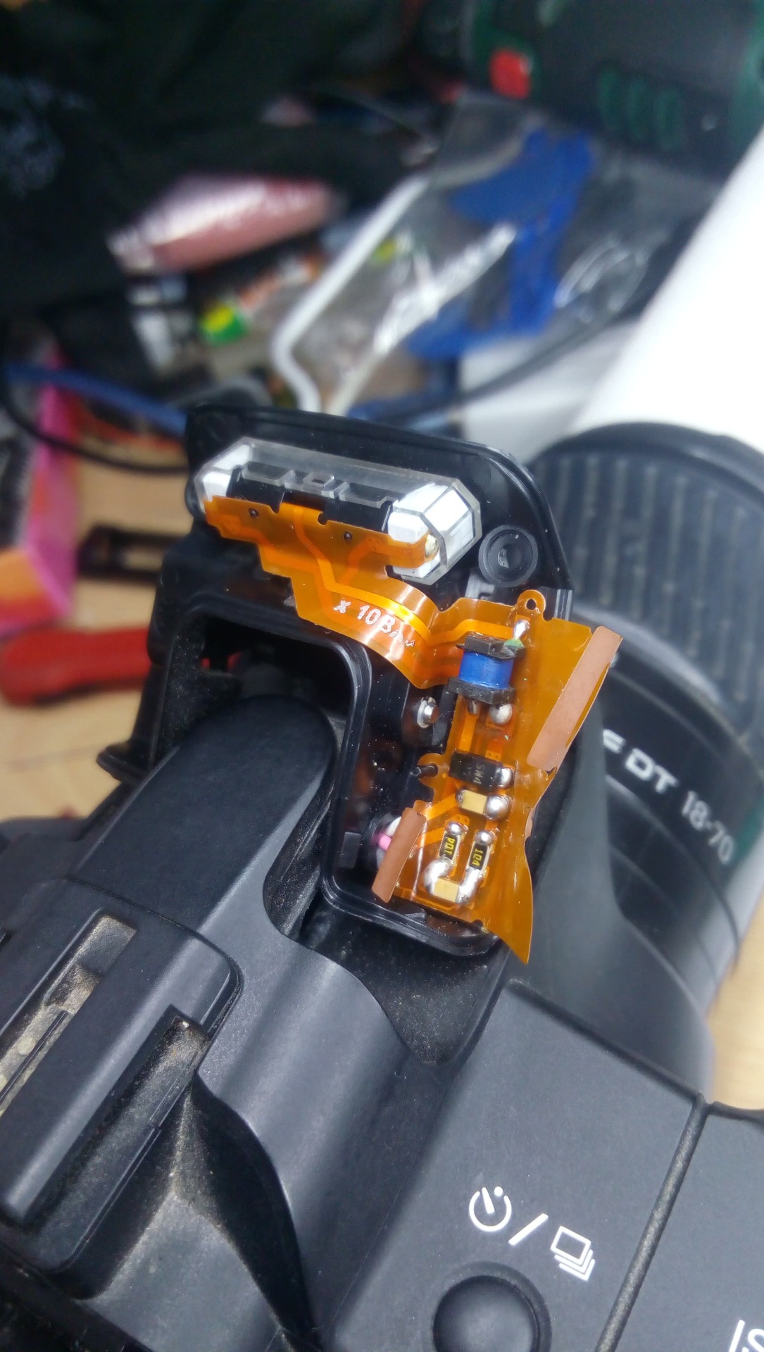 A képen ami látszik, az szerintem az elsütésnek a trafója és meghajtása. Mikor a fényképezőgép beüzemeli a vakut akkor feltölti a kondenzátorát, ezt egy fütyülő hang kíséri, a hangból meg lehet mondani, mennyire töltött fel, mikor kész akkor elhallgat. Ha nem tudja elérni a feltöltött állapotot akkor állandóan fütyül. Ez lehet gyenge akkutól, de valószínűbb a feltöltő áramkörben van hiba, vagy a nagyfeszültségű kábelek szigetelése sérült és szivárgás van. Nézd meg alaposan az átvezetőnél a "színes" drótokat. Próbáld mozgatni, hasonló esetben nekem ott volt megtörve, néha dolgozott, néha nem.
