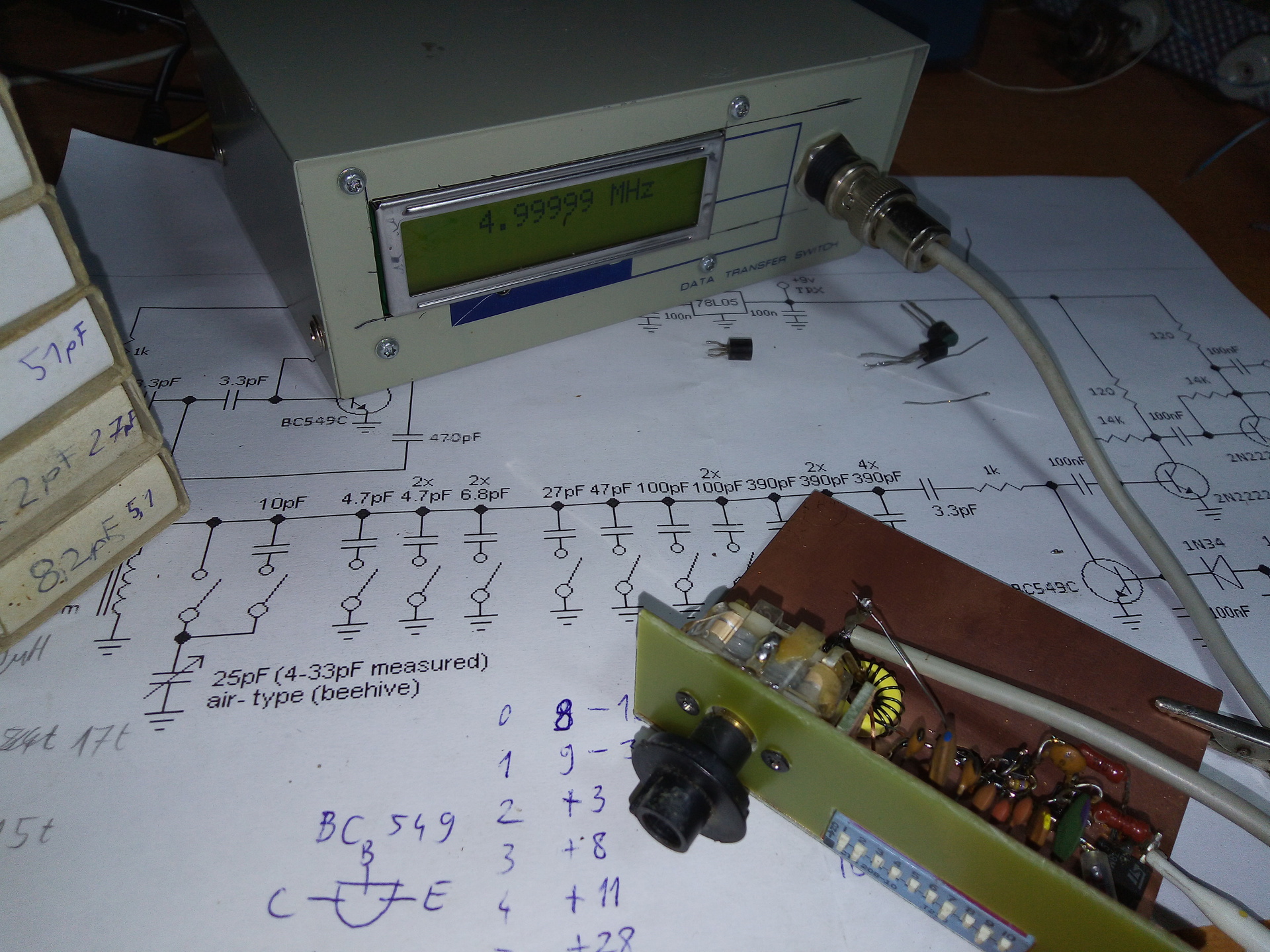 Én is tegnap este találtam ki, hogy megépítem a már korábban belinkelt miniVFO-t. Az oszcillátor rész össze is állt, be is indult. Nekem pont kisebb frekvenciákon áll le. Kb. 650pF kapacitás környékén kb 4,1MHz a legkisebb frekvenvia. A maximum pedig 32MHz. Valószínűleg nagyobb induktivitással kellene próbálkoznom (tekerek még fel pár menetet), hogy a jósági tényezőn javítsak.