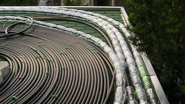 Az 1 méter átmérő kevés. Akármilyen meleg van, a csövekre ajánlott minimális hajlítási sugarat nem érdemes megközelíteni. Nagyon komoly energiaráfordítással 25-ről 20-ra csökkentve a belső sugár hajlítási faktorát, csak 1 méterrel több csövet tudsz egy menetbe préselni. Ez is csak akkor sikerülhet, ha tűző napon, segítséggel dolgozol. Ha el tudsz érni másfél-két méteres külső átmérőt, akkor nyert ügyed van - egy menetbe 70-130 méter elhelyezhető. 50 méter cső kevés, az valamivel több, mint egy vödör víz. Ez még 10 köbméteres medencéhez is nudli. Értékelhető, mérhető hatást legalább 200 méter csővel lehet elérni. Az általad rajzolt megoldás nem jó, mert nagyon gyorsan fog áramlani a víz. Jobban jársz, ha párhuzamosan kötöd a kis csigácskákat, akkor megnő a keresztmetszet, lassabb lesz az áramlás. Nem szükséges meleg vizet előállítani, elég ha pár fokkal melegebb, de az sok legyen. Óránként 1 köbméter 2-3 fokkal melegebb vízzel egy hét alatt termálmedencéd lesz. Ha sok időd és helyed van, akkor meg lehet próbálkozni az olcsó megoldással, ez a PET palack borítás. Erről csatoltam képeket. Minél kisebb, 1/3, vagy 1/2 literes üdítős palackot érdemes használni, ha az embernek vannak gazdag barátai, vagy vendéglős ismerőse. Emiatt nem érdemes kisebb kiszerelésben venni az üdítőt, mert az árkülönbség egy hétvégén 1-2 méter megvehető LPE csövet jelent. 1. Feldolgozott PET palack. A fél literes optimális, aránylag kevés helyet foglal el. A kis kupakosok jobban megtartják a csövet, a nagykupakosok könnyebben felhúzhatók a csőre. 8-10 darabot érdemes egyszerre felhúzni, ha többet próbálunk, akkor deformálódhat. 2. A "hőtükör". Jó, ha van, de macerás. Fémfóliával bélelt italosdoboz az alap, az egy literes 6-8 félliteres PET palackot ki tud bélelni. 3. Mivel a sufni nem szabályos négyzet, a sarkoknál több hely maradt. Ide felraktam a kísérlethez készült, palackba bújtatott csöveket. Ráadásul szereléskor nagyon meleg volt, a tetőn meg nem ajánlatos sörözni. Így ilyen lett . Ha több türelmem van, rendesen eligazgatom. Ezen a képen is láthatók a kis színes műanyag karikák, amiket a nagyszájú PET palackok nyakáról operáltam le, a tekergetés/elrendezés alatt jó szolgálatot tett az LPE cső kordában tartásával.4. A visszavezetés gondot jelentett. A fekete LPE cső csúnya, álcázni kellett. Átlászó lágy PVC csövet kötöttem a végére, a kanyarokhoz pedig villanyszerelők által használt könyökcsövet húztam rá megvezetésnek. Így rugalmas, hajlékony, és nem túl feltűnő bezetés lett belőle. Ezt a megoldást lehet alkalmazni a vízvételre is. A hőcserélő felesleges. Fontos, hogy minél mélyebben legyenek a csővégek - a melegítés hatékonyabb a hidegebb víz esetén. Ne felejtsd el kiüríteni a csöveket télire, ha megfagy a víz, tönkreteheti a munkádat.