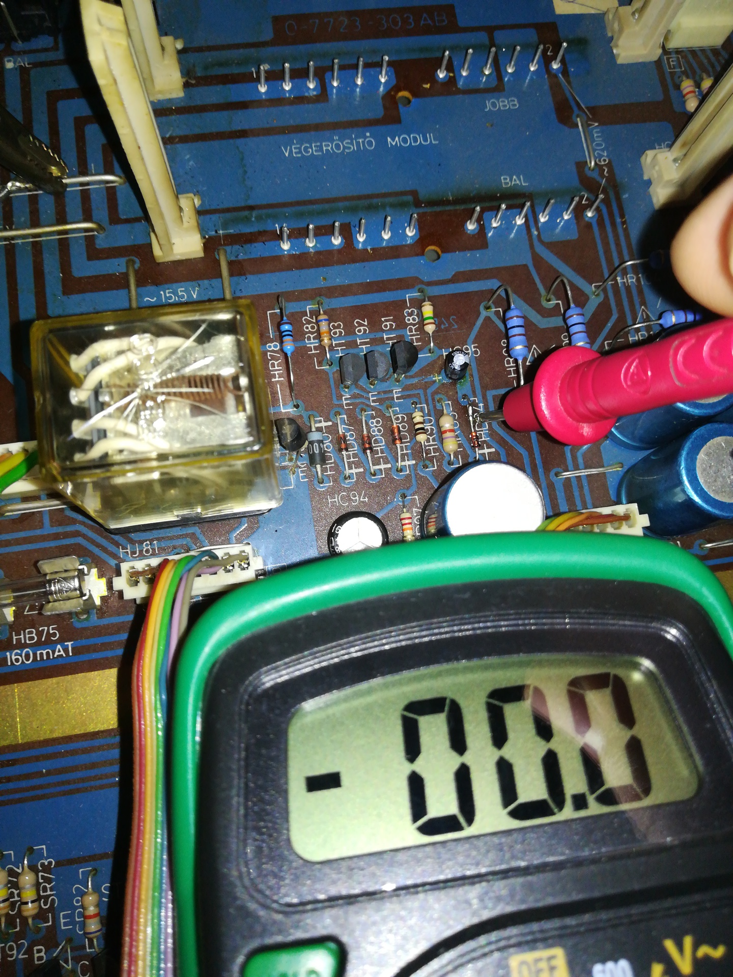 Elnézést, elírtam. A HD84-re gondoltam. Értelem szerűen itt ugyanannak a 3.3V-nak kellene lennie, mint HR79 egyik felén. Ellenőrizd! Amíg a HT91 bázisára nem kerül 1-1,3V, addig nem fog behúzni a relé.