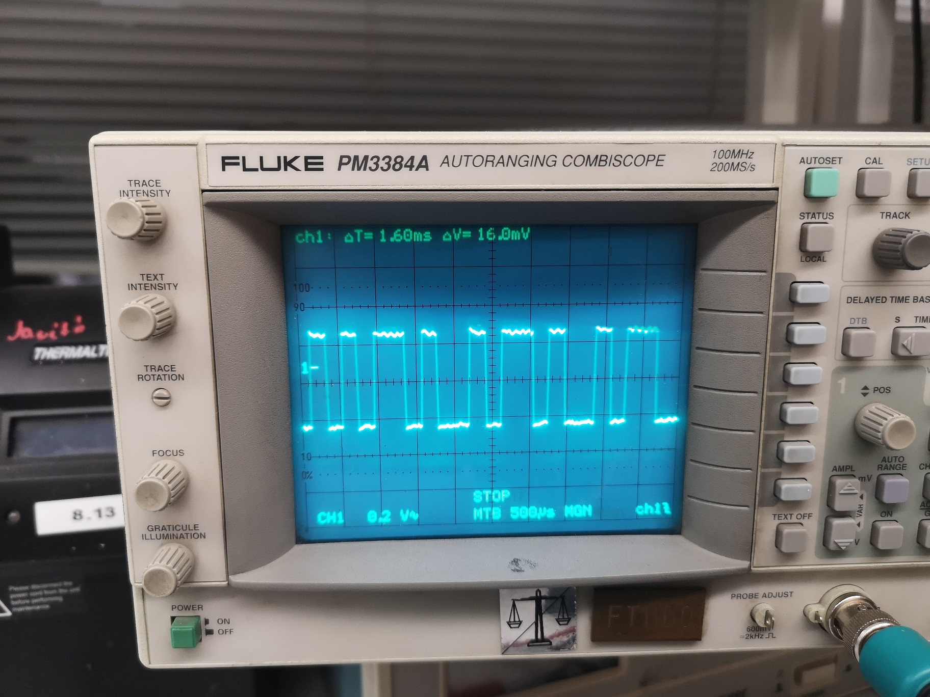 Sajnos a kínai barátunk le csiszolta az ICk-ről a feliratokat, így maximum találgatni tudunk, én PIC-re tippelnék így ránézésre. Az adó közvetlenül a 8 lábú IC-hez (5-ik láb) csatlakozik. Tárolós szkóppal csináltam képet amit az adó "Data" lábán néztem, sajnos analizátorom nincs.