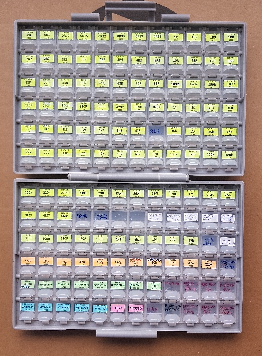Az SMD cuccokhoz menjetek el a sarki trafikoshoz, és kérjétek el az öngyujtok csomagolását ( rendszerint hulladékba kerül).egy-egy rajzlapot közbetéve egy megfelelö dobozban rengeteg dolog elfér bennük. A mélyedések kb 1,5-2 cm mélyek, igy biztosan nem vándorolnak el az alkatrészek