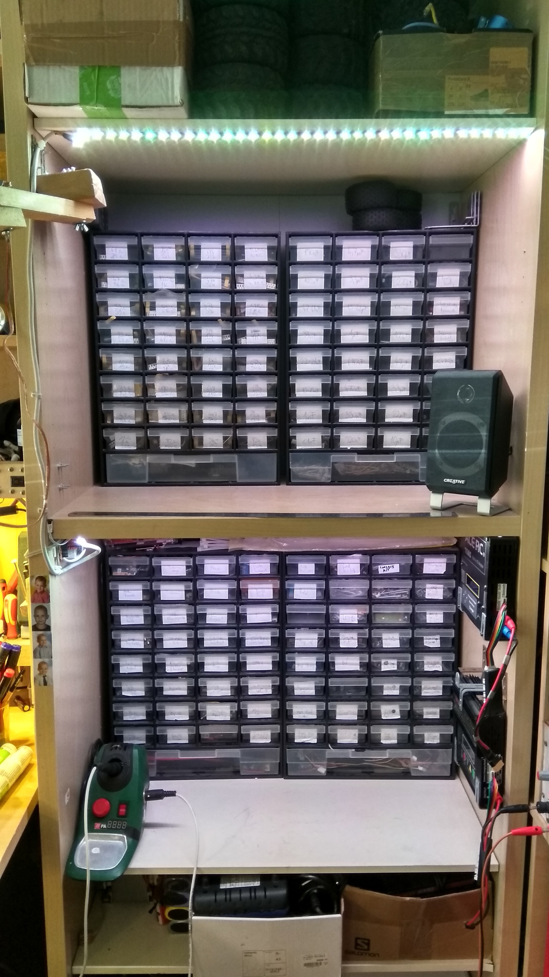 Én rendeltem Alkotó kollégától anno egy alkatrész-tárolót. Mondhatom, hogy remekül bevált. Vannak kifejezetten ellenálláshoz (diódához) készült fiókai, és vannak nagyobbak (pl. kondenzátorokhoz, tranzisztorokhoz, stb.) is. Annyi rekesz van bennük, hogy egy normál műhely alkatrészei simán elférnek benne, de akár több is egymás mellé/fölé tehető. Szemmel láthatólag olyan tervezte (Alkotó), aki maga is foglalkozik elektronikával. Nagyon "ki van találva", ezúton is hálás köszönet érte!