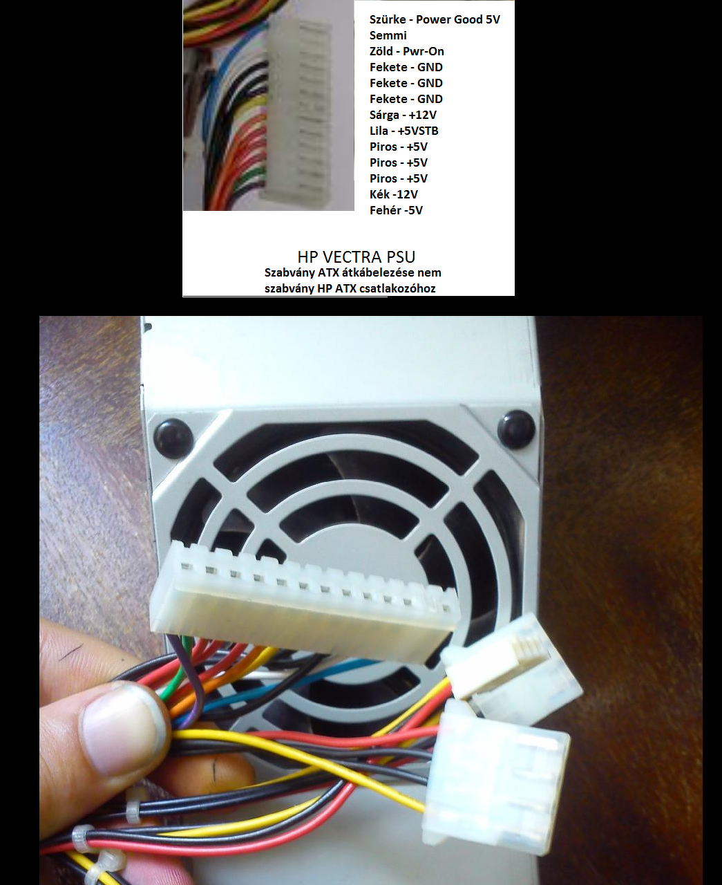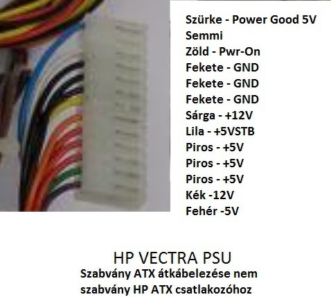 Köszönöm a válaszokat, végül egy orosz oldalon megtaláltam az eredeti HP tápkivezetéseket, tényleg ATX táp volt hozzá. Csak a színeken kellett kicsit módosítani. Felírtam, hátha még kell valakinek később.