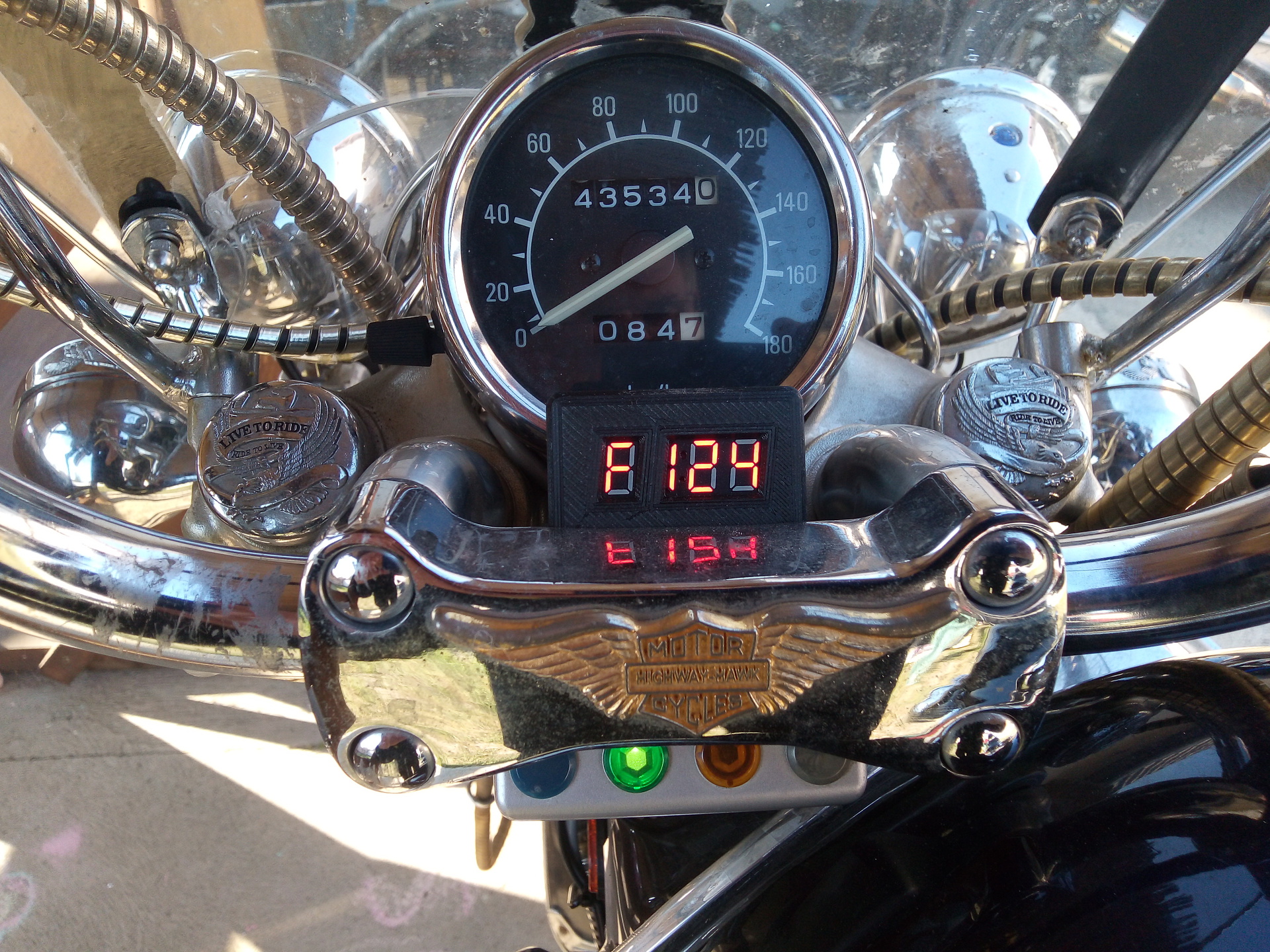 Szeretném bemutatni legutóbbi projektemet. Motorkerékpáromon sokszor jártam úgy, hogy 50Km/h-nál elfelejtettem 5.-et váltani, mert a motor hangja nem hívta fel rá a figyelmemet, vagy elbambultam. 100-nál pedig próbáltam feljebb váltani, de már nem volt hová. Ekkor készítettem el az első kijelzőt, ami mutatta a fordulatot, és jelezte az aktuális sebességfokozatot. Természetesen az ürest is jelezte. Két problémám volt vele. Egyrészt nem illett a motor stílusához, másrészt túl vaksi vagyok én már ahhoz, hogy egy ilyen kicsi karaktert rendesen lássak. (00-ás kép) Ezért újra gondoltam a dolgot. A 01-es képen látható az a kijelző (nevezetesen egy HW_069_display) amit bedobozoltam egy 3D nyomtatott házba. (02-es kép a ház belülről) Előtte még a céljaimnak megfelelően előkészítettem. (03-as kép) A 04-es képen a tesztüzem látható. A ház alján lévő ívelt rész a kormány átmérőjéhez lett igazítva, így ez a pár grammos kijelző kétoldalas ragasztóval van a kormánycsőre ragasztva. (05-ös kép) Ez így már nekem jobban tetszik, mint az előző. Mint mondják, evés közben jön meg az étvágy. Ezért a korábbi funkciókat kissé felbővítettem. Lévén a fokozatokat a kerék fordulat és a motorfordulat viszonyából számolja, így van kerék jelem, gyújtás jelem, üres jelem, valamint mivel a motortól kap tápfeszt, így az akku is mérhető. Ezen kívül van egy poti, amivel a kijelző fényereje szabályozható. Tehát mérhetek fordulatot, sebességet, akkufeszt és számolhatok fokozatot. Persze nem egyszerre. Kellett tehát egy gomb, ami váltja a fordulat és sebesség mérést, illetve kellett egy kapcsoló, amivel feszmérésre válthatok. A 06-os képen épp a feszmérés látható a gyújtás ráadása után. Sajnos nincsenek a kijelzőn tizedes pontok, így a kijelzett feszültség 0,1V-onként értendő. Folytatás újabb hozzászólásban. |