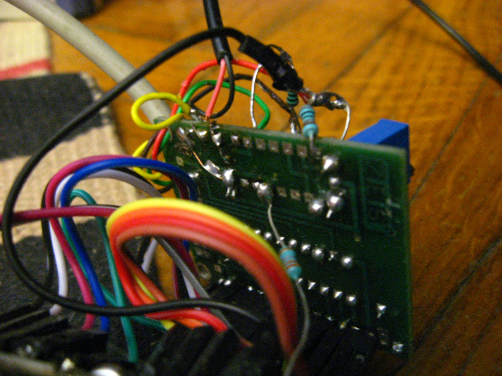 A második fotó az alkatrész oldal, amin a jobbszélen bejövő szürke kábel a bilentyűzet kábele. A harmadik fotó pedig a forrasztási oldal. (Lehet, hogy eléggé ronda, de legalább működik a kijelző...)