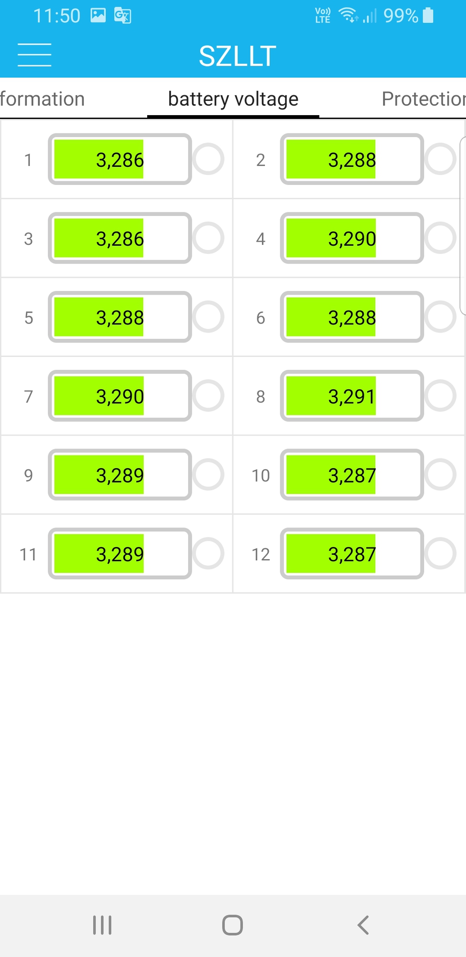 Az akkucellákra 7000mAH volt írva, amit sejtettem, hogy nem fognak tudni! Párhuzamosan 2, sorba pedig 12 lett kötve. A BMS-t bluetooth-on keresztül látom a telefonon, ami azt az infót írja, hogy az akkupakk 12,6AH-ra sikerült. Ez tök jó szerintem!
