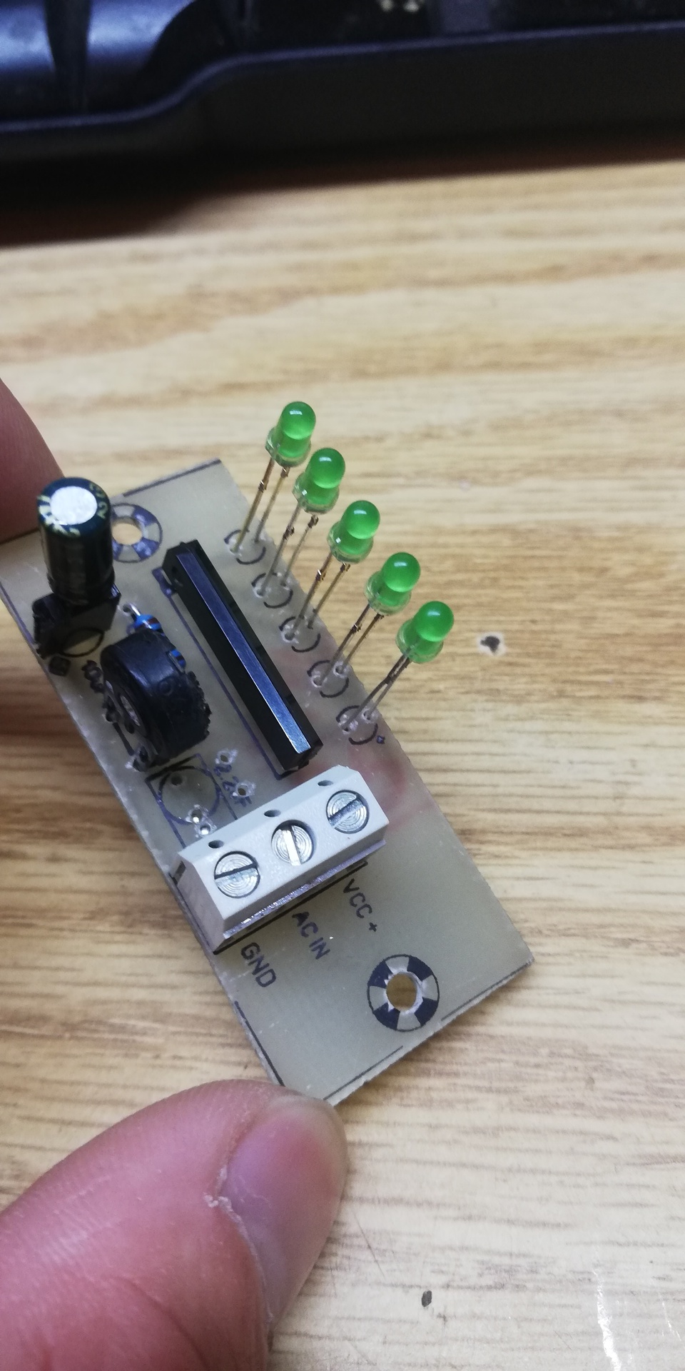 Sziasztok! Bemutatom ezt a kis audió szint mérőt amit napokban építettem vasalós technikával 5 ledet vezérel, az ic egy B1423N nevezetű "rudacska" sajnos a javasolt 10K ellenálással és 10µF kondival ütemre csak 1-2 led villan.