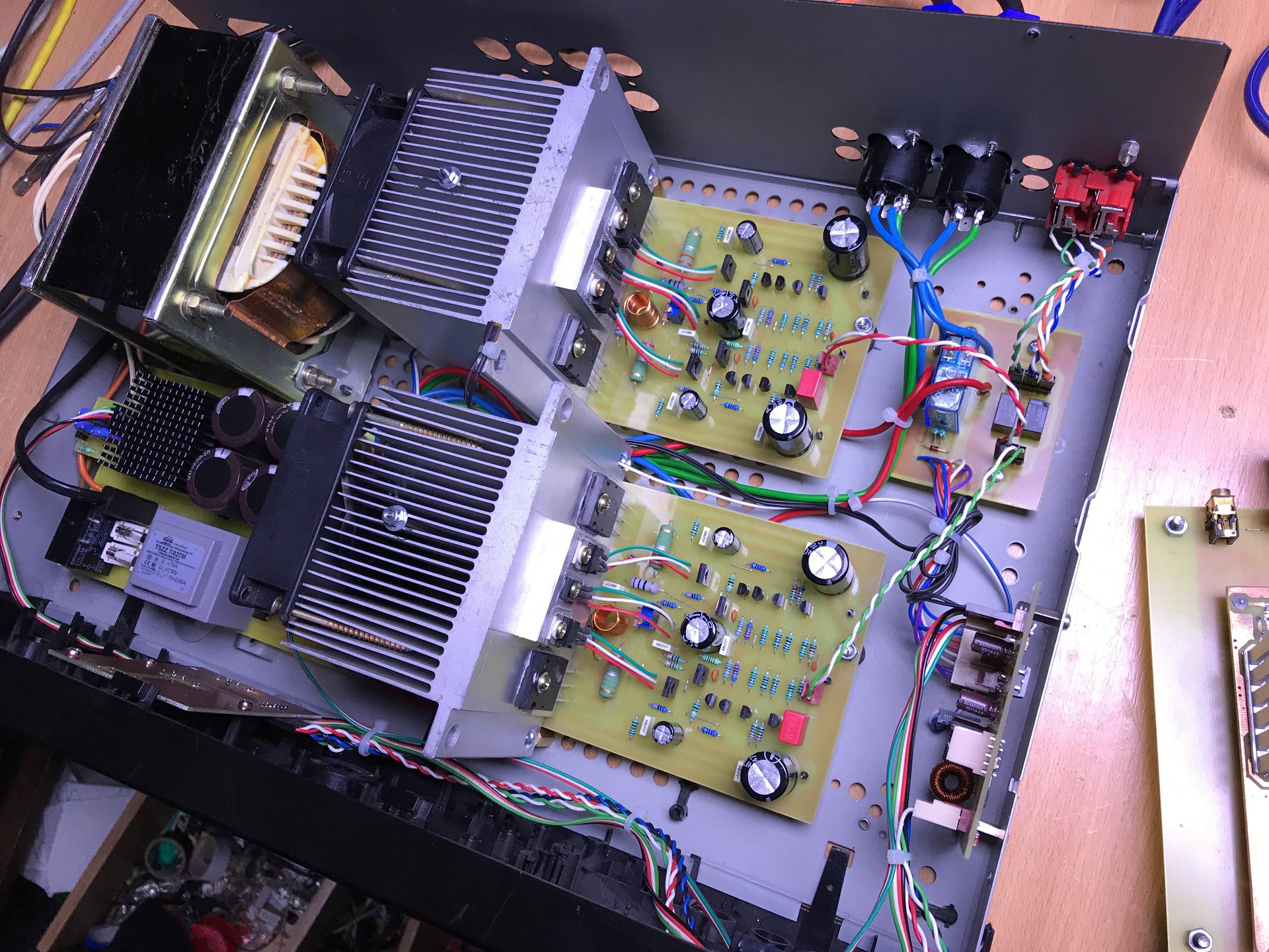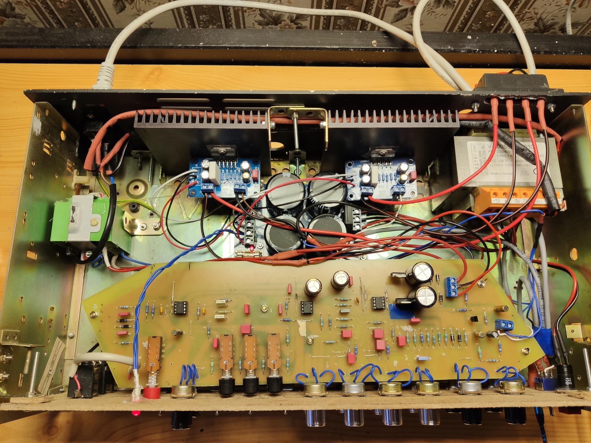 Ez pedig egy lm3886-os sztereó erősítő, kiegészítve 2 gitárelőfokkal, egy régi videoton tuner dobozában.