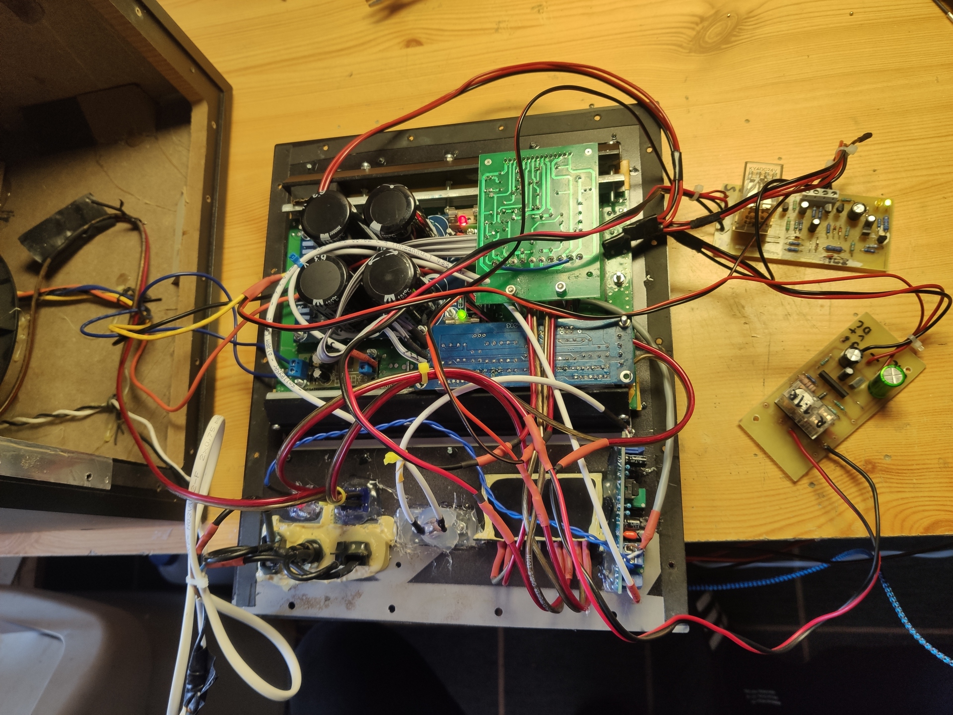 Egy Logitech Z5500-as 5.1 subjának a hátlapjába építettem egy 2.1-es erősítőt. A végfokok kitekből lettek kiválasztva. A mélyet egy hidalt Tda 7293 pár hajtja, a sztereo párt pedig egy 496-090-es stk. A mélyhangszórót lehet külön,passzívan is használni egy kapcsoló segítségével. Aktívan pedig állítható a frek.levágás és a hangerő a hátsó potikkal. Mivel nem akartam ezeket a batár hűtőbordákat átfúrni, meghagytam az eredeti szorítólécet és a paneleket fordítottam meg. A gyári nyákot ami a hűtőbordába csúszik lecsupaszítottam és mindent ahhoz rögzítettem. A trafója a gyári 14-14; 26-0-26 os toroid. Sajnos utólag kellet bele hangszóróvédelemet tenni, viszont ezeknek nem terveztem helyet a hátlapra, így a doboz aljába lettek becsavarva. Kíváncsi vagyok a véleményétekre, megköszönöm ha leírjátok. Üdv.: Pali