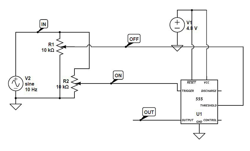Tudom, hogy a billenési szintek fixek, ezért választottam a tápot, ez 4,8V-os stabil táp. Így a billenési szintek pontosan 1,6 V és 3,2 V lesznek. A figyelendő feszültséget pedig potméterrel leosztva tudnám finomhangolni a pontos billenést.