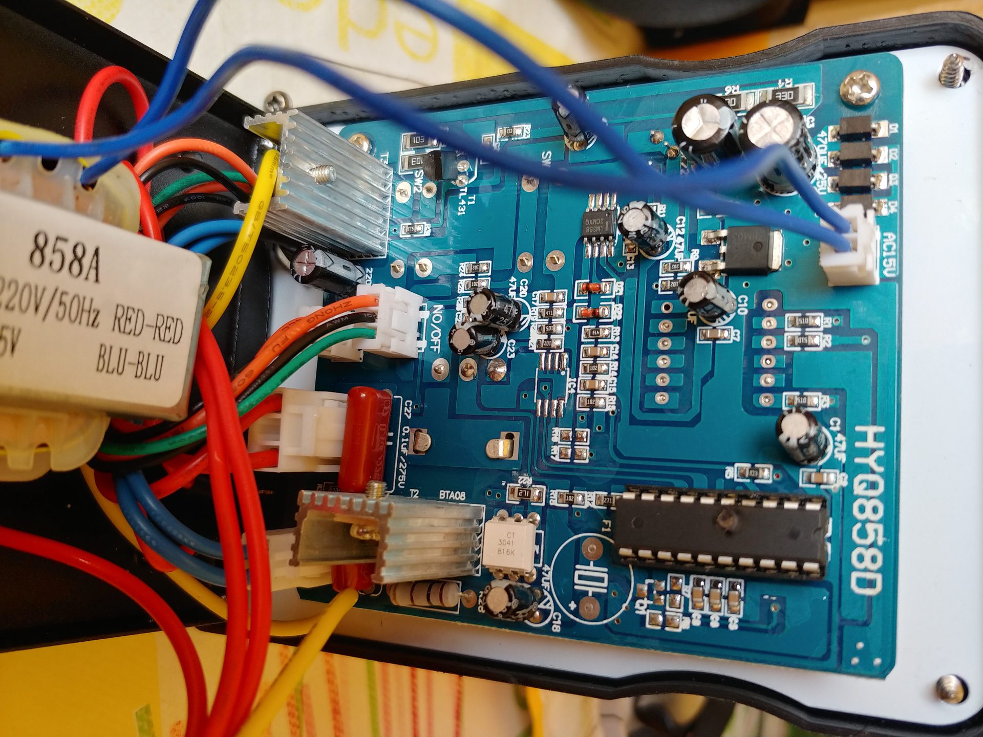 Az én UYUE 8586 állomásommal akadt gondom. Minekután a forrólevegős részen megcsapott a 230, átnéztem a belsejét és kiderült, hogy direktbe van kivezetve a csatlakozóra az áram, s csak azon múlik megszakítja-e a fázist a panel, hogy milyen irányban dugtad be a kábelt a fali aljzatba. Ezen picit módosítottam és azt a szakaszt lereléztem, ez jól is működik. Azonban ennek örömére egyszer csak megállt a forrólevegő részben a levegőszállítás (beállt a ventilátor), s kijött a füst... Nosza megnéztem mi a helyzet, s egy kondi adta ki magából a tartalmát így (nagy örömömre), s innentől kezdődött a "kálvária". Kondicsere után kipróbáltam, s a venti továbbra se ment, hát azt szedtem szét és megpróbáltam külön tápról, venti kuka -> megrendeltem a cseredarabot (rögtön kettőt). Mikor megérkezett, csere, s láss csodát van légszállítás. Igen, de ekkor hiába tekergettem bármerre is a levegőszállítás potiját, mindig csak teljes fordulaton ment. Újabb próba a külön táppal, s nem a venti a hibás, és nem is a rossz bekötés. Na itt rövidre is zárom a dolgot, pár alkatrészt már kicseréltem azóta, amik rossznak bizonyultak, így a TIP122 kapott BD901-et cseredarabként (az egyedüli alkatrészbolt, ami még személyesen is ad alkatrészt, nem tart TIP122-t, csak TIP120-at, így kerestem helyettesítőt náluk), s most a zéner lett cserélve. A jelenlegi tünet (a zéner cseréjétől függetlenül is ez volt az utolsó állapot), hogy a venti kimeneten gyönyörű egyenáram jön ki, azonban annak a szintje pont ellentétes irányban változik, mint kellene neki. Kínomban már kirajzoltam (kétoldalas panel, átvilágítva, multival mérve és végigkövetve a vezetékeket) a kapcsolását ennek a résznek, de a hibát csak nem találom. Eddig a lerajzolt történetben cseréltem: Q5 - TIP122 helyett BD901 (lábkiosztás stimmel, odafigyeltem, ellenőriztem többször is) D1 - a panelra írt 8.2V-ból kiindulva BZV55C8V2 típust kapott C1 - eredetileg 220µF volt benne, de itthon 470µF kondim volt megfelelő tűréssel, viszont nem változtat az eredményen, ha az eredeti értéket rakom vissza Következő lépésem még a Q6-Q7 kimérése lesz, s az egészet be fogom dobni LTSpice-ba, hogy szerinte milyen feszültségértékeket kellene kapnom, de ha valakinek van még ötlete, hogy mitől lehet ez a jelenség, az ne tartsa magában! A rajzon UC-vel jelölt vezeték a jó alaposan lekapargatott mikrovezérlőhöz csatlakozik. A fényképen a jobb alsó területen található a kirajzolt szakasz, a venti csatlakozója a jobb oldalt alul lévő két pólusú csatlakozó. A második képen látható bal oldali két poti közt már nincs fizikai kontaktus (sajnos összeértek, s ez okozott egy kis hullámos működést, de miután megtaláltam, ezt megszűntettem). A hozzászólás módosítva: Ápr 14, 2020