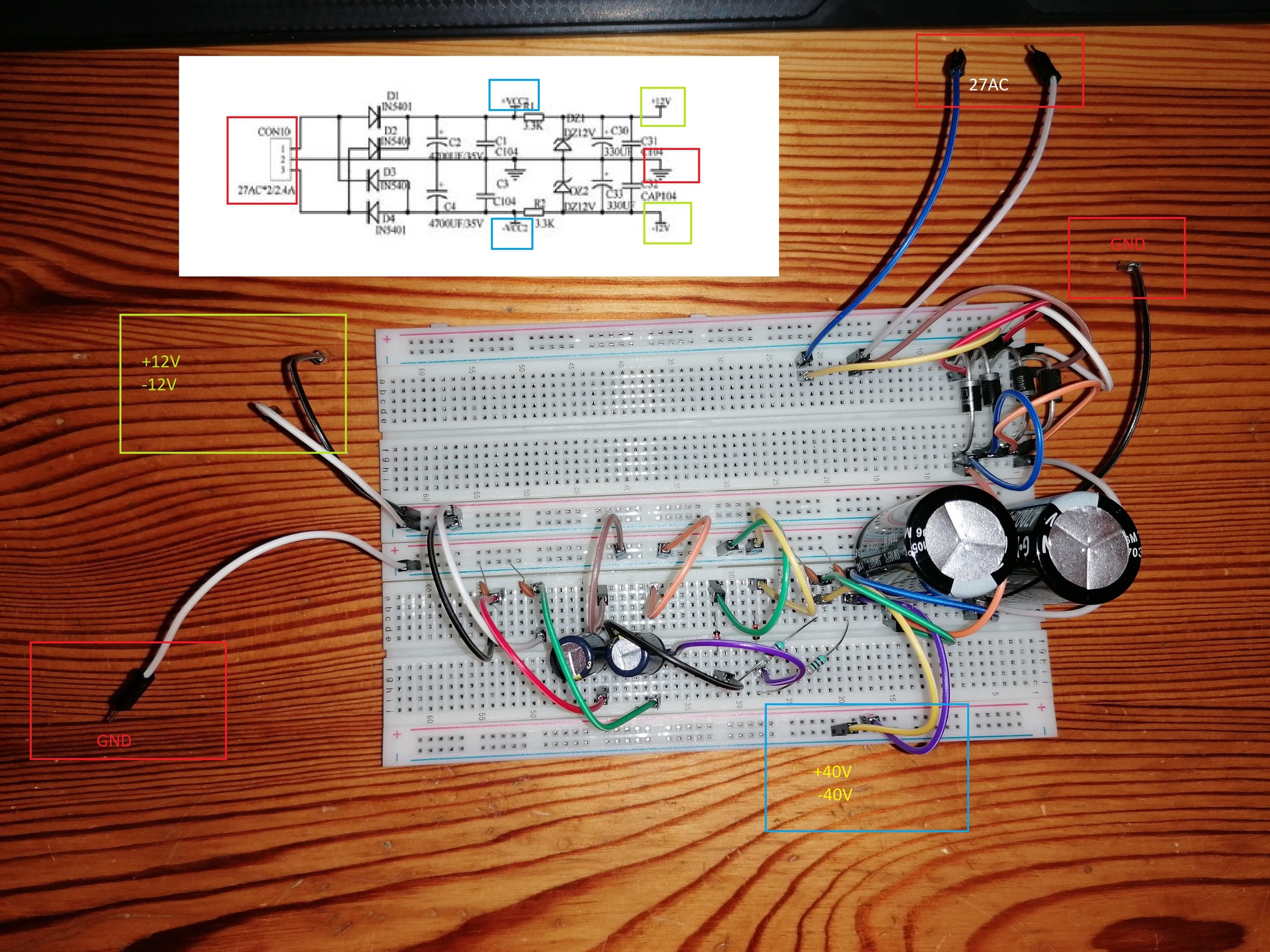 Nem tudtam, hogy ilyet próbapanelen nem lehet összerakni. - Lehet ezért látom úgy mintha lenne váltófeszültéség a 12V-nál?Mérésnél a +12V GND-re csatlakoztattam a multimétert és váltóáram mérésre kapcsoltam. A trafó is a gyári, lemértem, van középkivezetése és megvan a 27V (AC) igazából 29V az, de gondolom azért, mert terheletlen. A 12V, ha jól bogarásztam az csak vezérlésre van, a végfokot 3.3K előtti +-40V hajta.