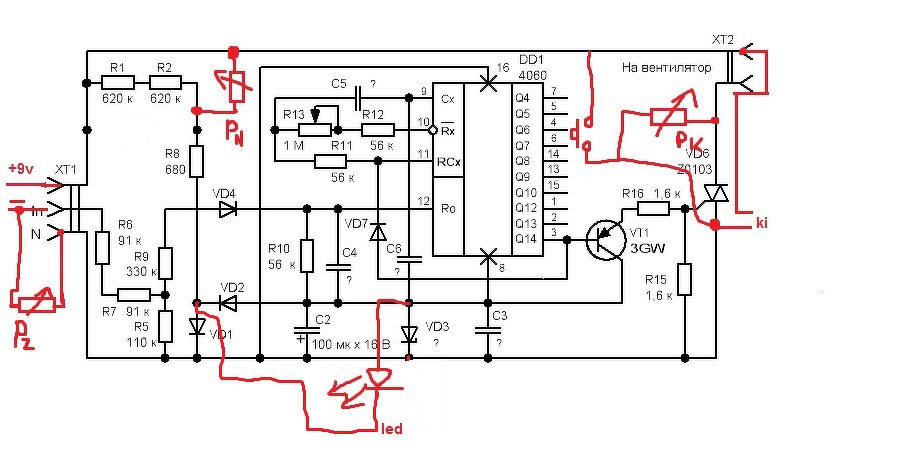 - Nem tudjuk, hogy az áramkör mi célt szolgál, és a hozzácsatlakoztatott gépnél mit helyettesít, milyen időbeli és feszültségbeli működési követelmény van. - Az általad készített képek nem alkalmasak arra, hogy állításaidat meg tudjam erősíteni vagy cáfolni. Többek között a panel felett a vezetékek gubancot alkotnak, nem látható honnan hova mennek. Így az sem található ki mi volt az eredeti szándék. Így aztán elég a "vak vezeti világtalan" jelenet van a tulajdonos részérő, Részedről és részemről is. - Látszatra az eredeti késleltető funkcióhoz a panel mindent változatlanul tartalmaz, a potik és dióda kiegészítésképpen szerepel. Kivéve a 220nF-os kondit, ami a váltóáramú táplálás szerves része, de erre nincs szükség a telepes táplálás miatt. - Tekintve hogy az áramkörben a Triac az eredeti helyén van, és a D7 is az áramkörben van, ez az áramkör az eredeti funkcióját tudja betölteni. Tehát ez egy monostabil kapcsolás, mely a tápfesz bekapcsolásakor a triac-ot bekapcsolja és a késleltetési idő lejárta után kikapcsolja a triac-ot. Ez az idő nem lehet "kicsi", ha a triac-ot a Q14-ről vezérli. Az időt továbbra is az R13-al változtatható. Ha a 9-es lábra menő kondi csak 10nF, és az R13 minimumra van tekerve, a késleltetési idő akkor is 10 másodper körül van. - A triac-ot egyenáramról működtetve és begyújtva többé nem kapcsol ki, csak ha az anódárama a tartóáram alá csökken. (Eredetileg ugye váltóáramról működik a kapcsolás.) A kimenti pontok kialakítása azért is meglepő, mert azok jelenleg a tápfeszültség két pontja között vannak, és a triac bekapcsolása esetén ez terheli a PK poti. - A nyomógomb jelenleg leginkább a triag kikapcsolására szolgálna, de mivel a késleltetés ideje alatt azt a tranyó begyújtva tartja így túl sok értelmét nem lehet látni. - Ha a terhelés és a PK poti értéke oly nagy ahol az anódáram a tartóáram alá csökken, akkor a késleltetés ideje után a triac ki tud kapcsolni, egyébként pedig nem. De a poti ha jól értem/látom akár rövidzárba is tekerhető. - A PZ poti bekötése meglepő, mert az igazából a tápárammal van sorba kötve. Annak szabályozása pedig elég értelmetlen dolog. - Te kötöd az ebet a karóhoz, hogy a táp a rajzodon szereplő polaritással van bekötve. Ez lehet, de akkor az hibás. Mert ha megnézed a telep negatív pont ja a PZ-n keresztül a tápszúrő kondi pozitív pontjára csatlakozik. A telep pozitív pontja pedig PN és R8-on keresztül a tápszűrő kondi negatív pontjára. De ekkor a telepről érkező fordított polaritású áramot a VD1 rövidrezárja. - Az alapaxióma, hogy az IC csak helyes polaritású táppal képes működni! De mivel a Led panelen láthatóan a VD2-re csatlakozik, az világítani nem fog, villogni meg egyáltalán. Ha a Led a tápárammal sorba van kötve (nem számítva a VD2-őt) akkor a késleltetés ideje alatt az R16 áram miatt világítana, majd a késleltetési idő lejárta után az IC 100uA körüli áramára vagy sötét, vagy halványan világít. De villogni nem fog, mert áramkörileg semmi köze az IC gyorsabb tárolóinak billenéséhez. Mindössze sanda gyanú szerint itt működés szempontjából annyi lehetne, hogy az áramkör a késleltetés ideje alatt egy kisebb, majd a késleltetés ideje idejének letelte után egy magasabb feszültséget adni a kimenti pontra. (Feltéve hogy ekkor a triac ki tud kapcsolni) Másik eshetőség, hogy a gép felől érkező (pld. impulzus jelet) tudná söntölni a triac a késleltetés ideje alatt. De az egész olyan kínos, mint a vaknak a némafilm. Mert azt sem tudjuk mihez hogyan csatlakozik az áramkör, mi lenne a feladata, és mit állítgatnának a kezelőszervek. A régi vicc jut eszembe erről, amikor a kapitány lekiált, hogy "Mennyi? - 30. - Mi harminc? - Mi mennyi?..