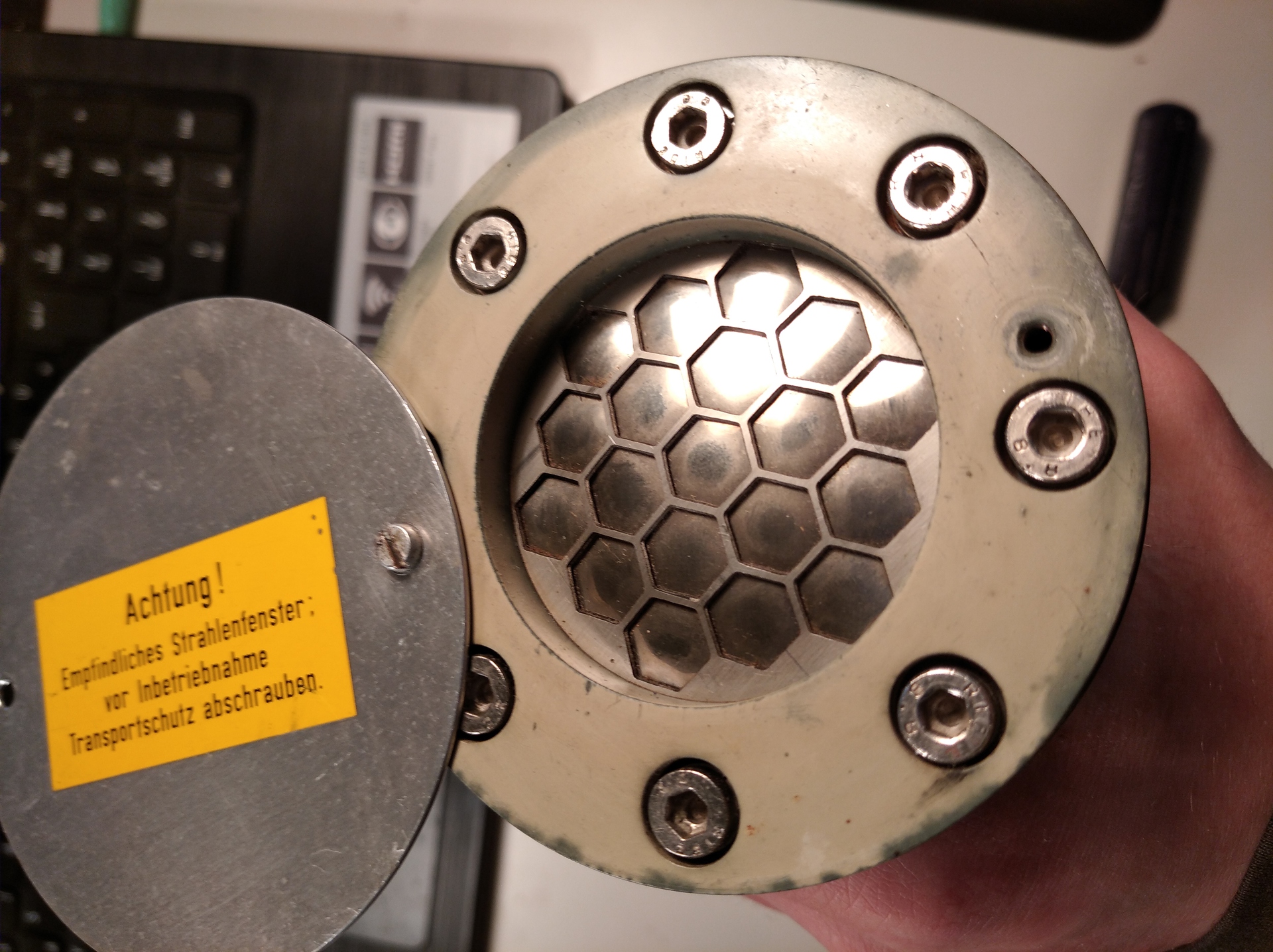 ![]() Az első egy szép méretes GM-cső, a másik meg egy argonnal töltött titán (25µm vastag) ablakos gamma gázionizációs kamra.