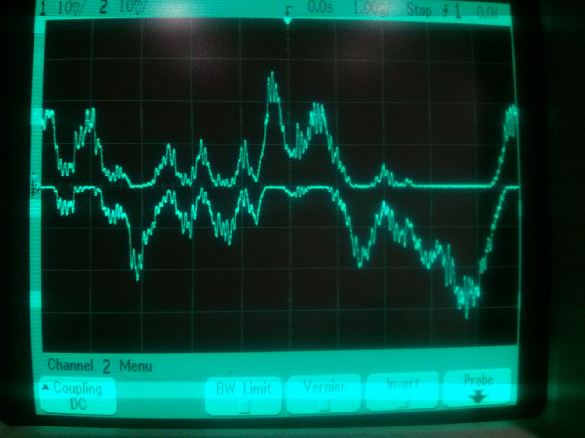 A földelt kimenetűnél felépítésénél fogva egyszerűen lehet mérni a végtranzisztorok áramát a nyugalmi áram beállító 0.1R ellenállásokon. Talán érdemes kicsit elgondolkodni mit látunk a szkóp fotókon és még nem is reaktív terhelésre dolgozott a kimenet.