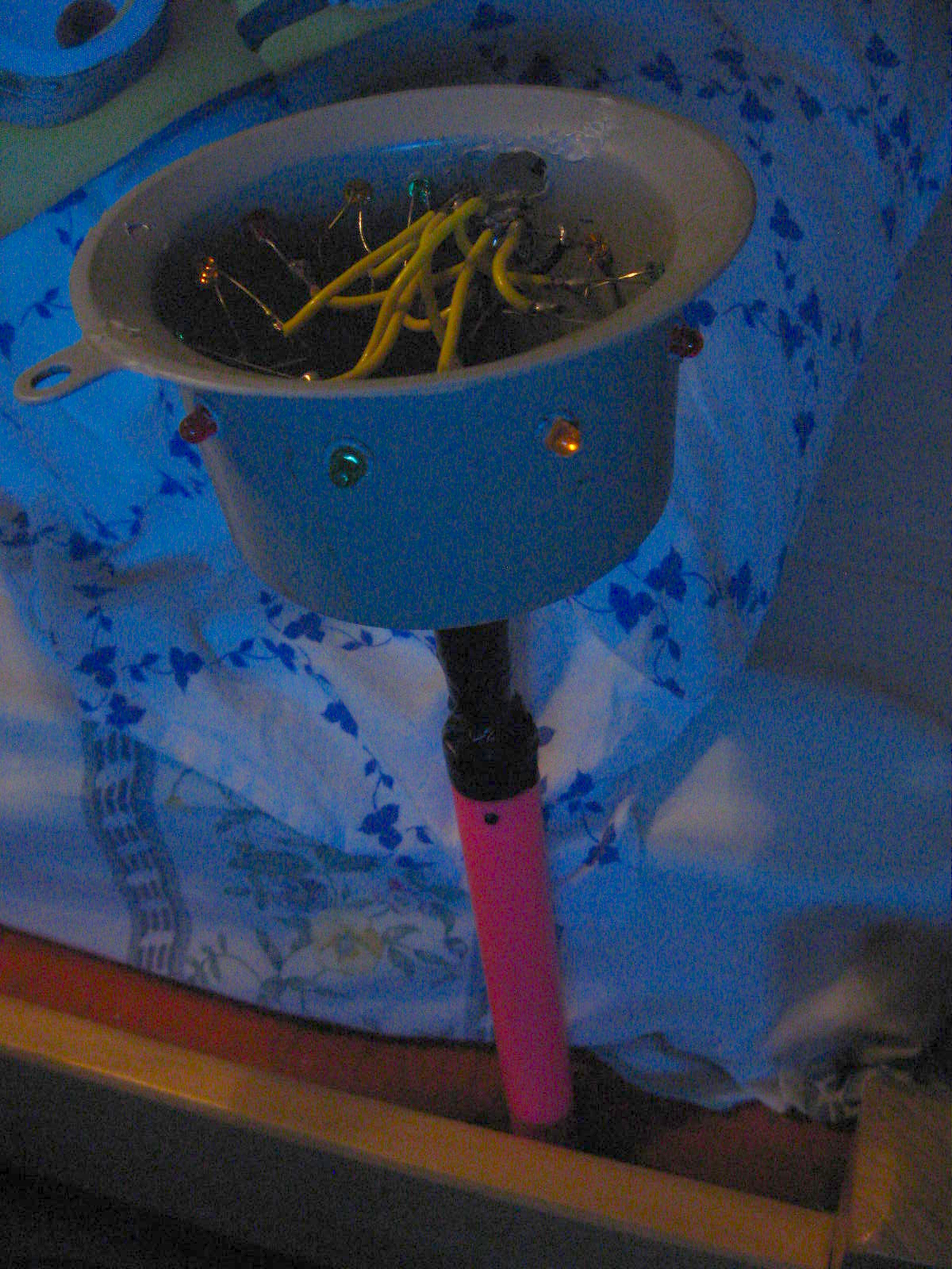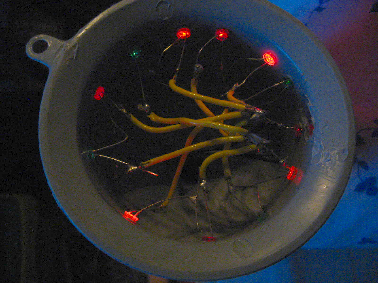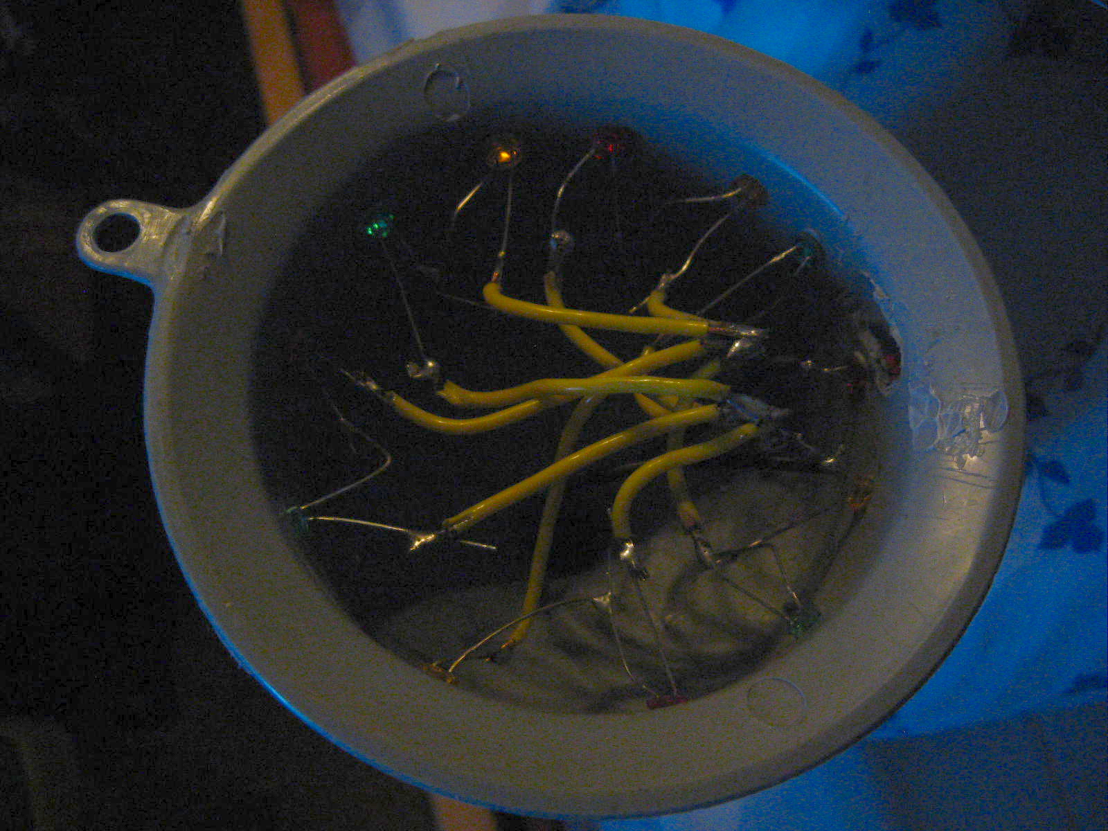 Egy ehhez hasonló "party fényt" találtunk az utcán törötten eldobva. Szétszedtem, a törött tetejét leszedtem, az eredeti színes füzért kikötöttem. Az épen maradt nyelére egy olcsó (100 Ft körüli) szürke magas falú tölcsért rögzítettem, körben kiluggattam pákával és 12 LED-et raktam bele: négy zöld, négy piros és négy sárga. A LED-ek kettesével vannak sorba kötve (mert többet sorba kötve már nem bírta) és ezek a párok vannak párhuzamosan kötve. ![]() Az utolsó két képen világít, melyet egy nyomógomb kapcsol: 1. gyors villogás, 2. lassú villogás, 3. folyamatos világítás, 4. kikapcs. Még azóta is az eredeti elemek vannak benne és még mindig bírja!