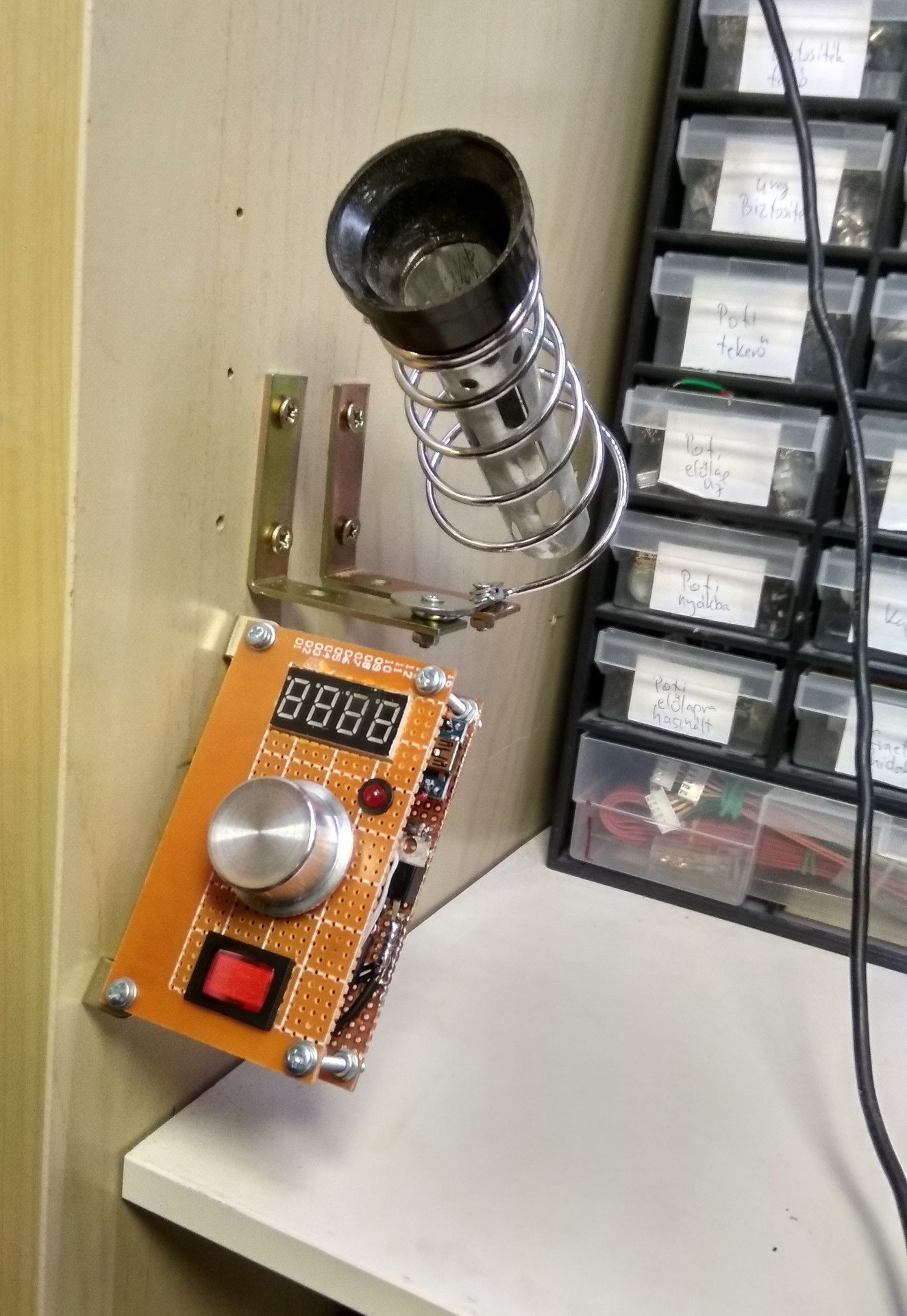 Becsapós a kép, mert az igazi munkaasztal az balra található, tehát a páka jobbkézre esik A páka az alkatrészes szekrényre lett rögzítve.Kaqkk: Elképzelhető, hogy lesz belőle szép nyák, hiszen majdnem minden meg van hozzá. Viszont az igényes munkát inkább másba ölöm bele, sajnos az én szabadidőm is véges. Ennek a projektnek gyorsan készen kellett lennie. Használhatóságból 100%-os, külcsíny: átlagos. Lehetne még egy nyomtatott előlapot rakni a nyákra, ez még belefér az időmbe (remélhetőleg). Gondolkodtam egy új forrasztóállomás vásárlásán, de az nem lett volna kicsi, oldalfalra szerelhető, egyszerű, olcsó (Hakko 907 kb. 2-3$), és gyerekzárat sem láttam még ilyen szerkezeten. Ezért kellett magamnak elkészítenem.