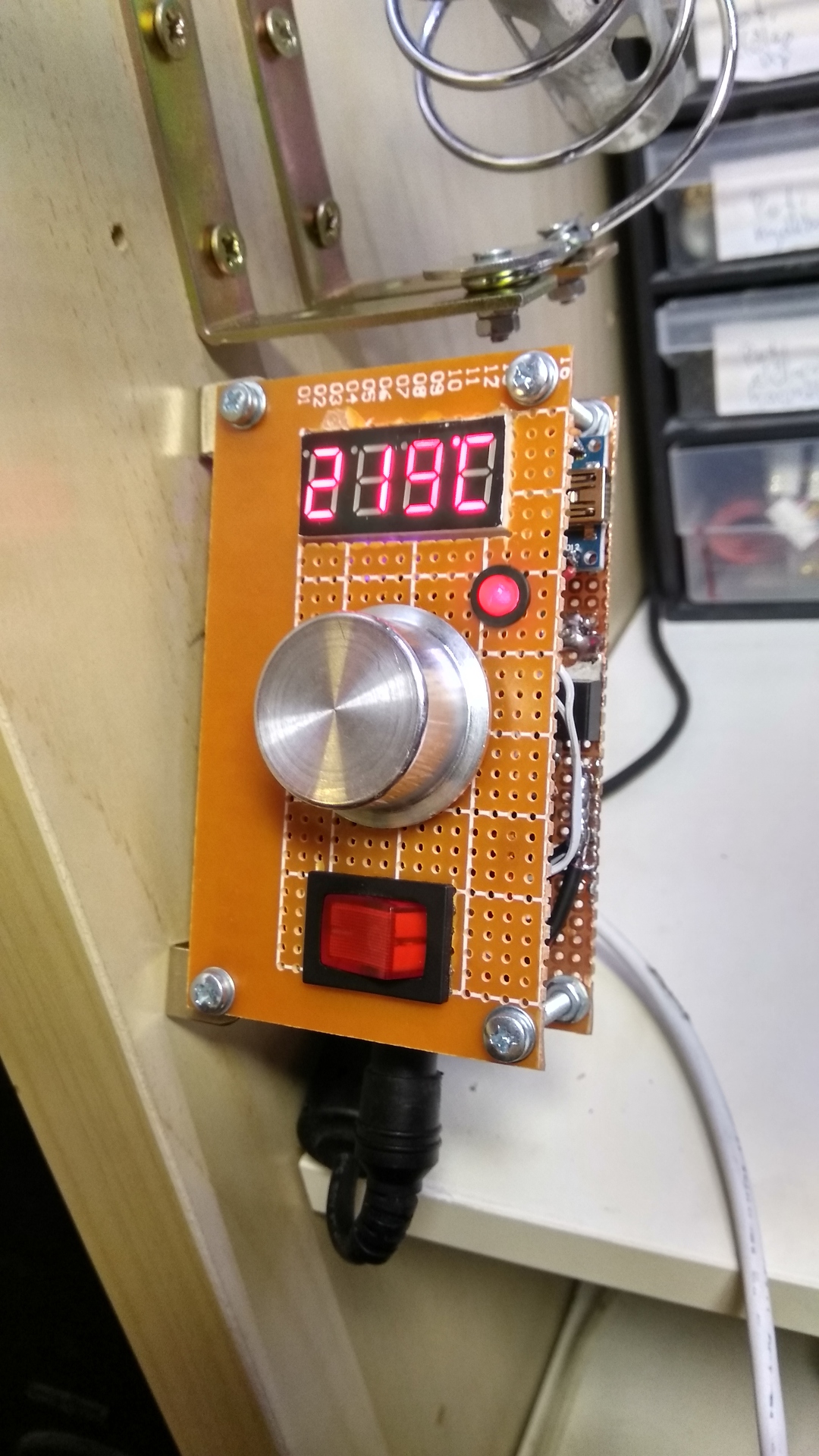 Átszereltem a "forrasztó állomásom" lebegőre, hogy soha többet ne essen le, és kihúzhatóak legyenek a mögötte levő fiókok. Az állomás már 2015 óta működik a Hakko 907-es klónnal, Arduino méri a hőmérsékletet és kapcsol egy N-Fet-et. Semmi extra. Mivel a gyerekek minden kapcsolót azonnal bekapcsolnak, ezért gyerekzáras. Bekapcsolás után 3mp alatt el kell tekerni a potit minimum és maximum állásba is. Csak ekkor fűt. Egyébként pedig csipog, jelzi egy felnőttnek, hogy "tiltott beavatkozás történt". ![]() Az előző légszerelve, SMD ellenállásokkal bírta 7 évig, akkor ez a szendvics verzió kb. örökké jó lesz. A belsejéről a képet elrettentésképpen raktam fel!