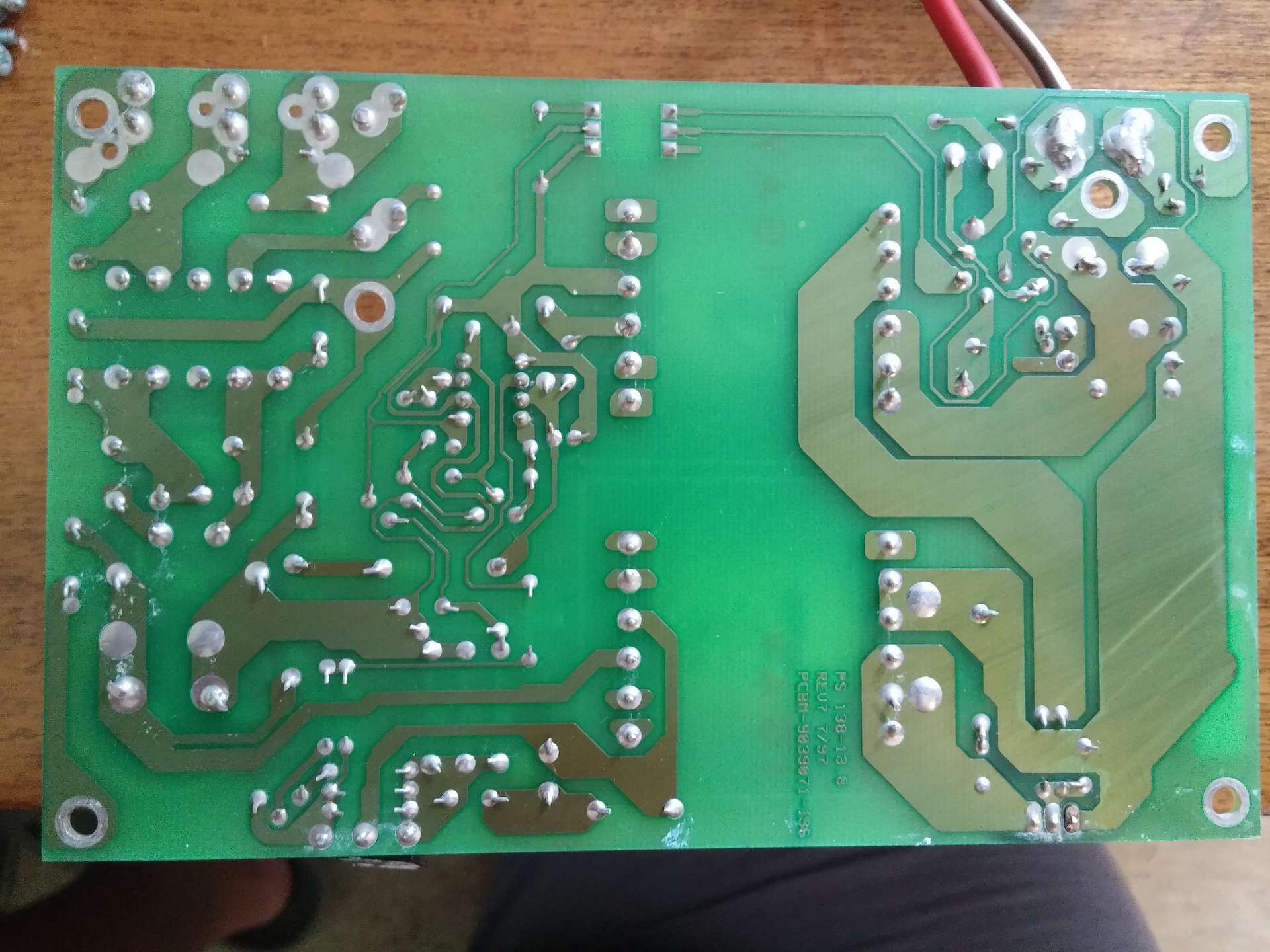 A következő képeken látható kapcsolóüzemű tápegység (230V -> 13.8V,12A) kimeneti oldalán kiment egy háromlábú alkatrész, az égés következtében a felirat olvashatatlanná vált.