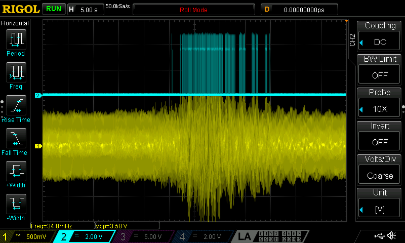 Az érzékelő tekercs egy transzformátor primer tekercse, alatta egy kis neodímium mágnes egy 3 mm átmérőjű pálcán. Az oszcilloszkóp képén a ház előtt elhaladó autó által keltett rezgések láthatóak.
