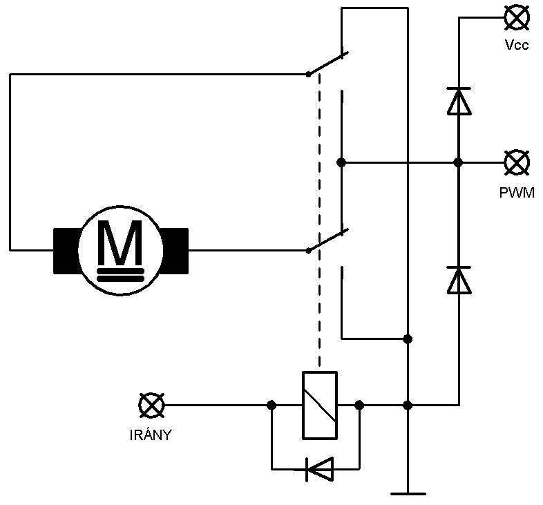 Arra gondoltam, ami a rajzon is van. Motoronként egy-egy PWM elég, amelyiken irányt is váltani kell, oda a relé a teljesítményágba kerül, a meghajtófokozat után. Így, ha a relé megfelel, H-híd sem kell, csak egy megfelelő tranzisztor, az irányt pedig egy digitális kimenet jelöli ki.