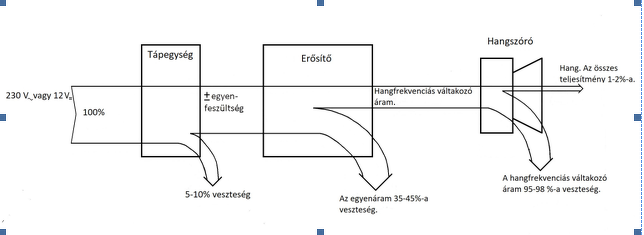 Az erősítőkbe bemenő teljesítmény töredék része fog kijönni hangfrekvenciás teljesítményként! A kijövő csökkent teljesítmény mehet a hangszóró(k)ba. Ez fordítva a fizika energia megmaradás törvénye szerint is képtelenség. Ez a digitális és analóg erősítőkre egyaránt érvényes! Az elmúlt oldalon már közöltem egy külföldi szakirodalom ábráját, melyet magyar szöveggel kiigazítottam. Ezt megismétlem. Aki ezt vitatja, annak értelmi és szakmai tudásáról nem kívánok nyilatkozni.
