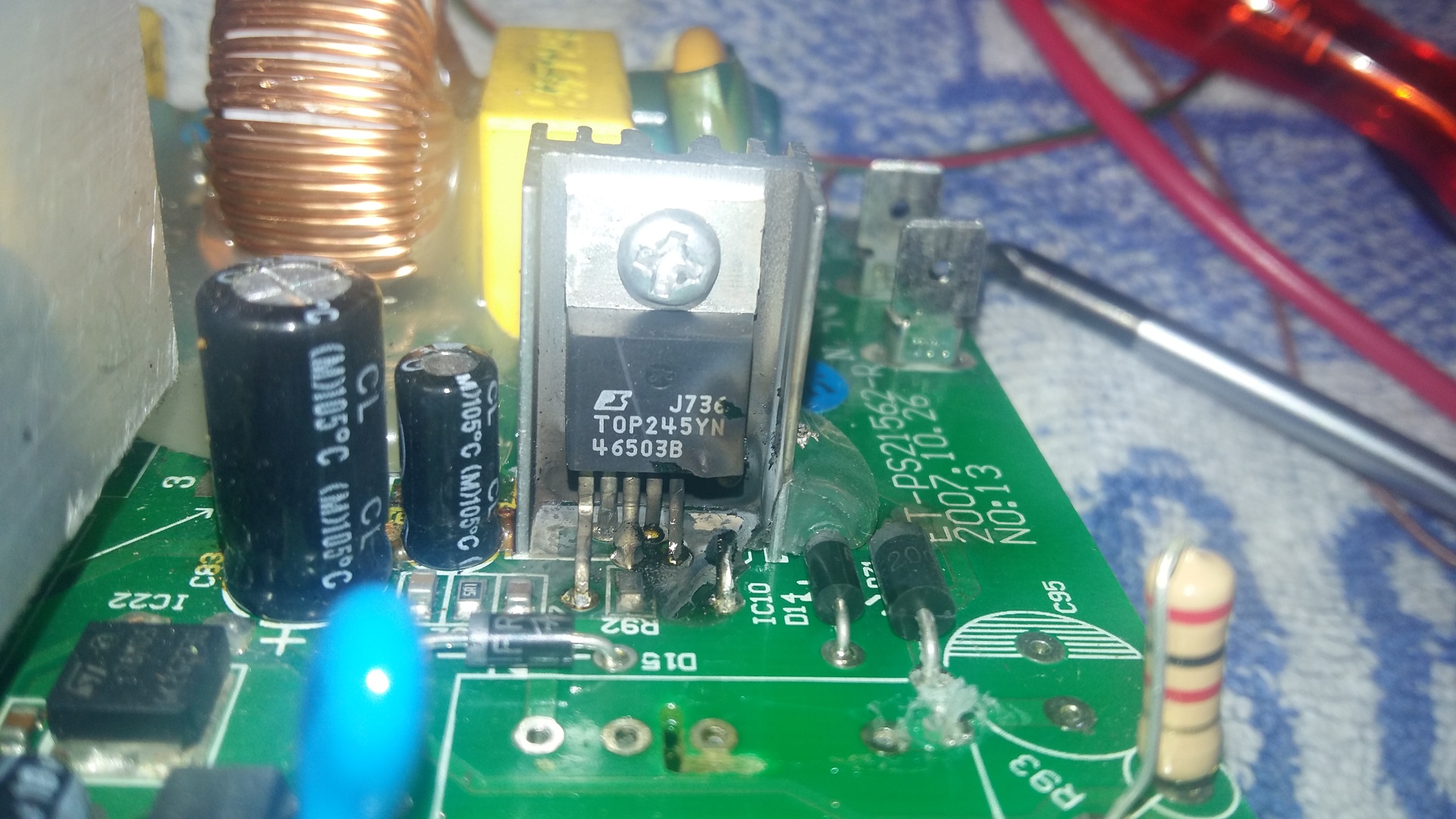 Javítottam egy panelt, amin a TOP245 úgy durrant el, hogy az alu hűtőborda 1mm-es lemezét simán átégette. Az utolsó képen látszik a lyuk is.