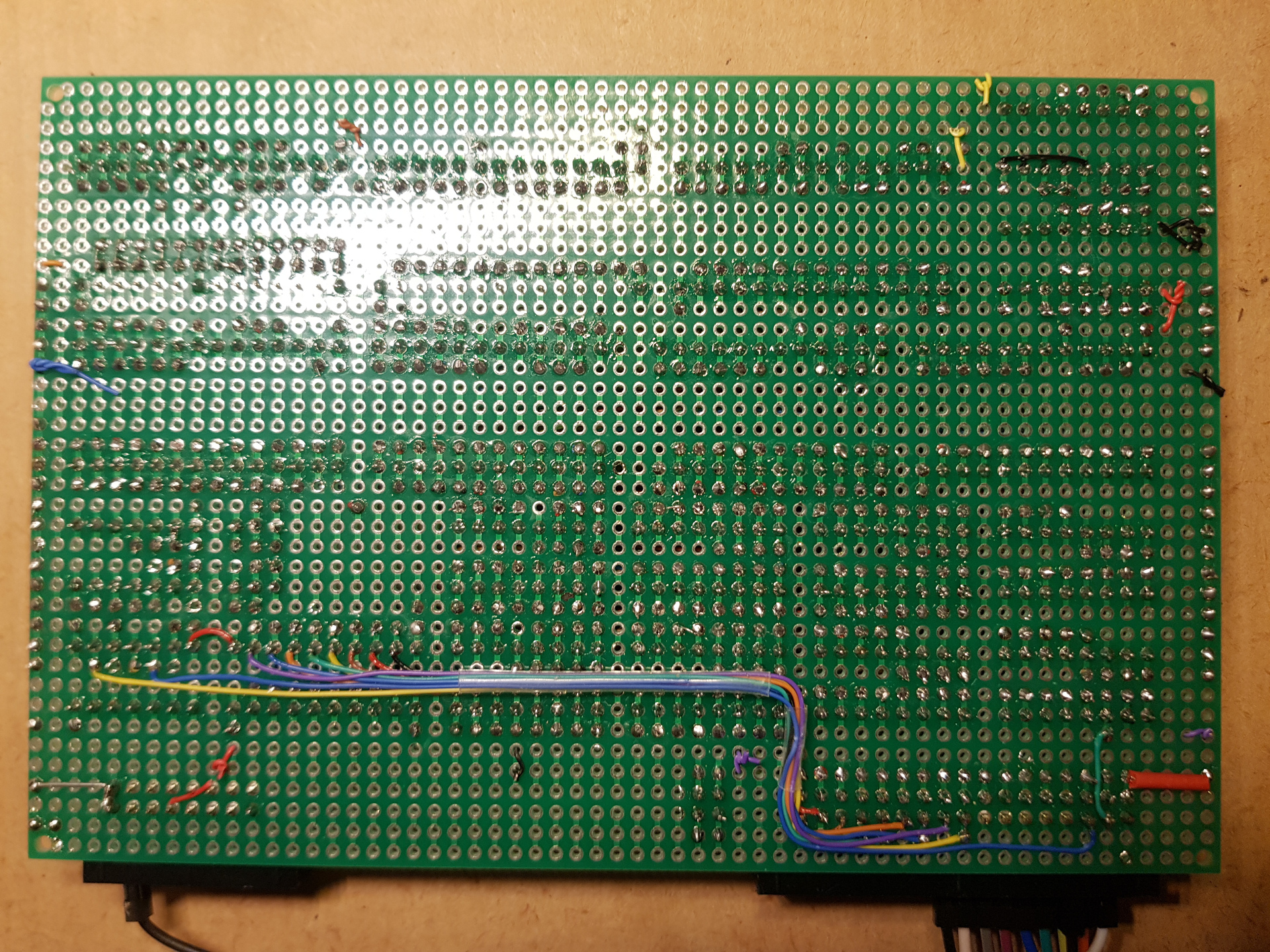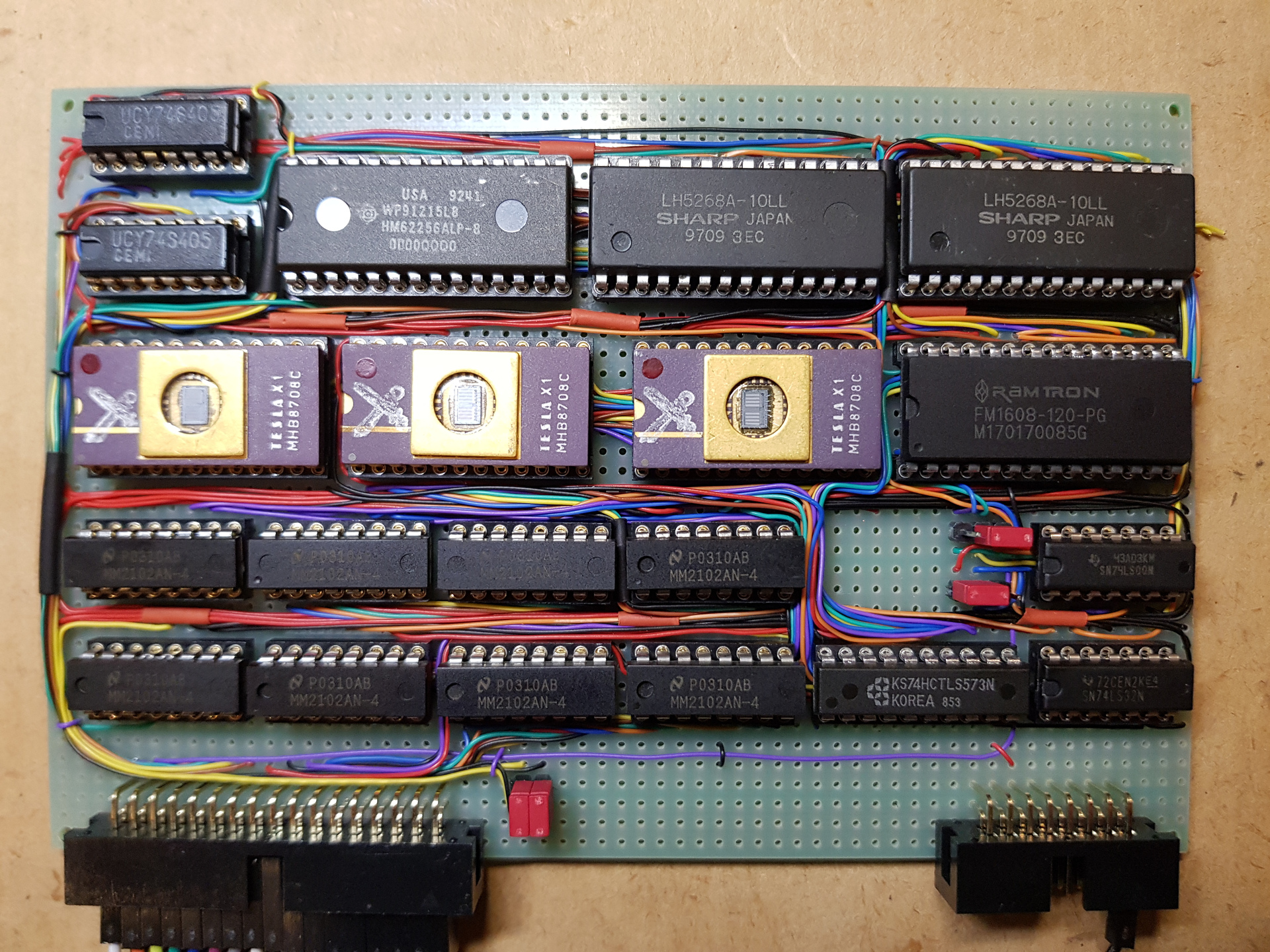 ![]() Egy elkotes volt benne es kihagytam egy szignalt, azt utolag kellett belefuzni (konnyebb mint latszik) Uzemmodok: 1. 3x 1k EPROM es 1k RAM (es az eredeti gep konfiguracioja) 1.b Az elso EPROM es a RAM cime felcserelheto egy kapcsoloval (jumper), igy a tokures (EPROM) gep is hasznalhato 2. 8k FRAM + 2x 8k RAM + 32k RAM (Ez fejleszteshez, nem resze a gepnek termesztesen) 3. 32k RAM valaszthato 0x0000 cimmel is, ekkor bootloader-el barmi beletolhato (pl BASIC, CP/M) A 2-3 pontok csak a teszt erejeig kerultek bele, nem 'illenek' az eredeti konstrukciohoz, viszont pazarlas lett volna mondjuk 64 darab 2102 (azaz a nekik valo foglalatokat) beforrasztani ![]() Sajna a csinos Tesla (talan katonai) EPROM-ok melle nem talaltam meg az aranyos 2102-ket (bar kicsit gyanus, hogy nem is volt nekem olyan)