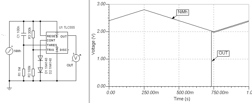 - Te monostabilról beszélsz, ami tényleg időzítő. Tehát egy impulzusra indul, és az idő lejártáig magas szinten van. Majd újra indítható. - Ha valami bebillen és úgy is marad, az a bistabil kapcsolás, de ennek Set és Reset bemenete lehet, de időről szó sincs benne. - Viszont Te 2V feszültség figyelésről beszélsz, ami egy komparátor. Most akkor hogy is működjön ez? Esetleg arról lenne szó, hogy ha kicseréled az elemet, a kimenet alacsony szintű legyen és ha az aksi lecsökken 2V-ra, adjon ki magas szintet és maradjon úgy? Mert akkor íme egy megoldás. De arra felhívnám a figyelmed, hogy a TLC555-nek a 2V a legkisebb működési feszültsége. A feszültség figyeléshez pedig referenciára lenne szükség, ami 2V mellett is állandó. Én most két dióda nyitófeszültségét használtam, ami kb 1.01V. De igazából egy ICL8069 vagy LT1004 BandGap dióda lenen a tisztes megoldás, de azok meglehetősen drágák két vacak aksihoz. Úgy kellene működnie, hogy amikor beteszed a két aksit és annak feszültsége magasabb mint 2V, akkor a kimenet alacsony szintű, amikor pedig lecsökken az aksi 2V-ra a kimenet magas lesz és ott is marad. Bekapcsolást a R1/C1 biztosítja, 2V feszültség esetén pedig at R2/R3 osztónak kell a 2V-ot a referencia felére osztania. A kapcsolás önfogyasztása azért nem nulla.